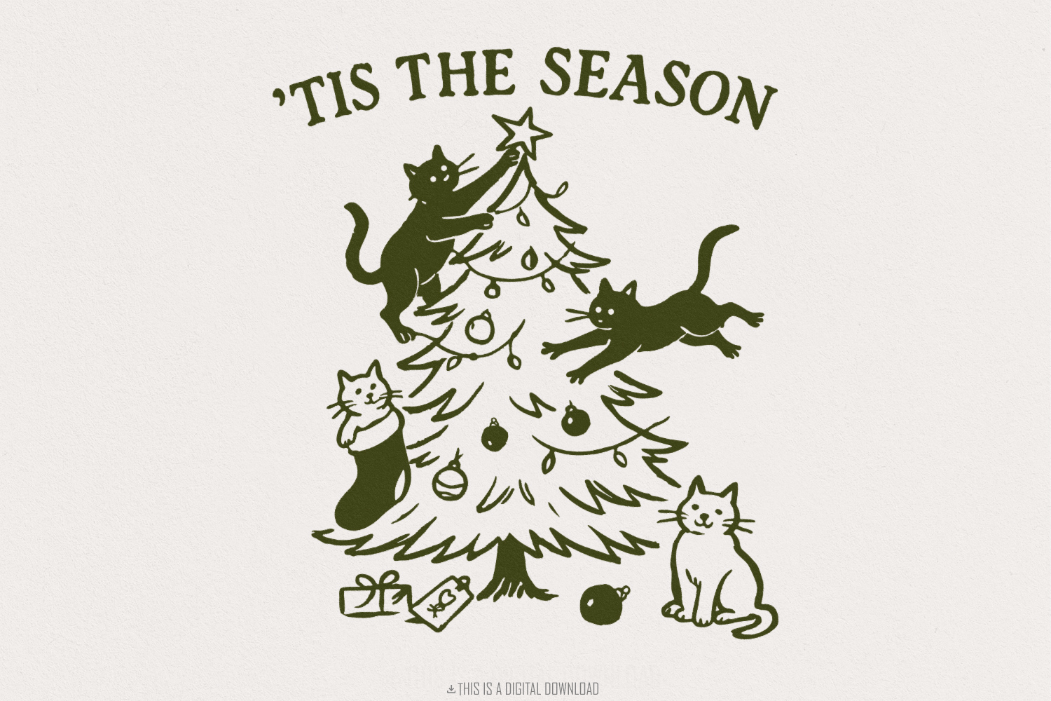 Tis The Season Cat Christmas PNG Digital Download, Funny Holiday Tree Kitten Clipart, Cute Pet Illustration