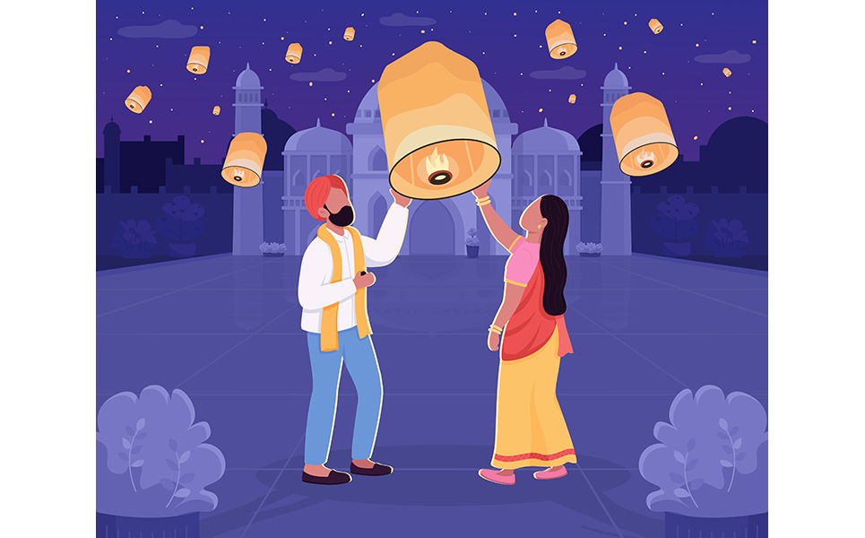 Traditional Diwali celebration flat color vector illustration. Cultural holiday. Light lanterns. Married couple in national clothing 2D cartoon characters with nighttime cityscape on background .