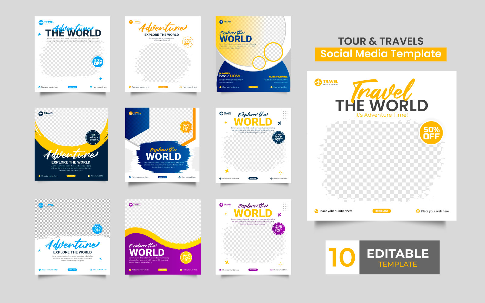 Travel agency social media post template tour advertisement banner design for travelling offer .This template best for any personal or corporate use.Ready to use for Multipurpose uses,All main elements are editable and customizable.
