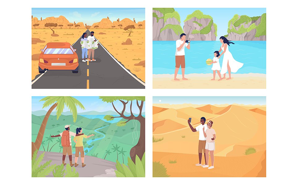 Travel destinations with friends and lovers color vector illustration set Illustration