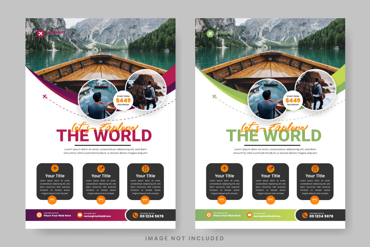 Travel flyer design template and travel agency flyer template design with contact and venue details. Ready to use for Multipurpose uses, All main elements are editable and customizable.