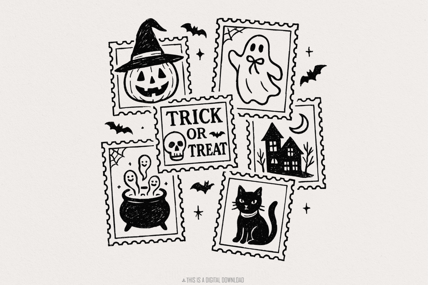 Trick Or Treat PNG, Halloween Digital Download, Black Cat, Ghost, Pumpkin Art, Spooky Clipart, Illustration