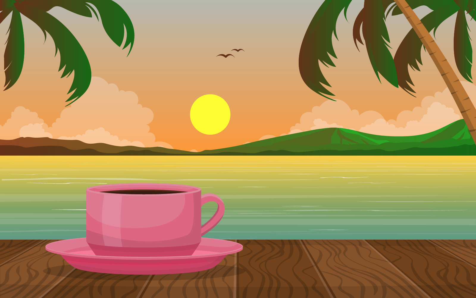 A Cup of Tea Lake Tropical Beach Sunset View Illustration