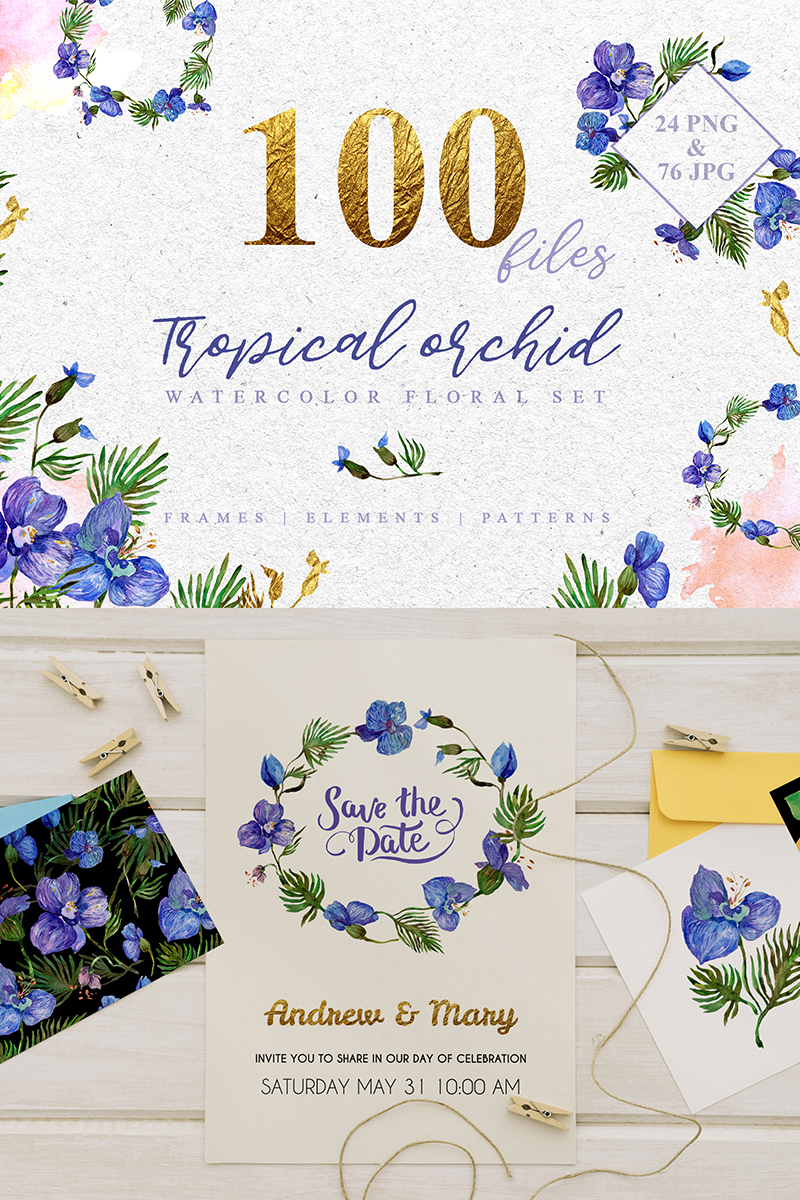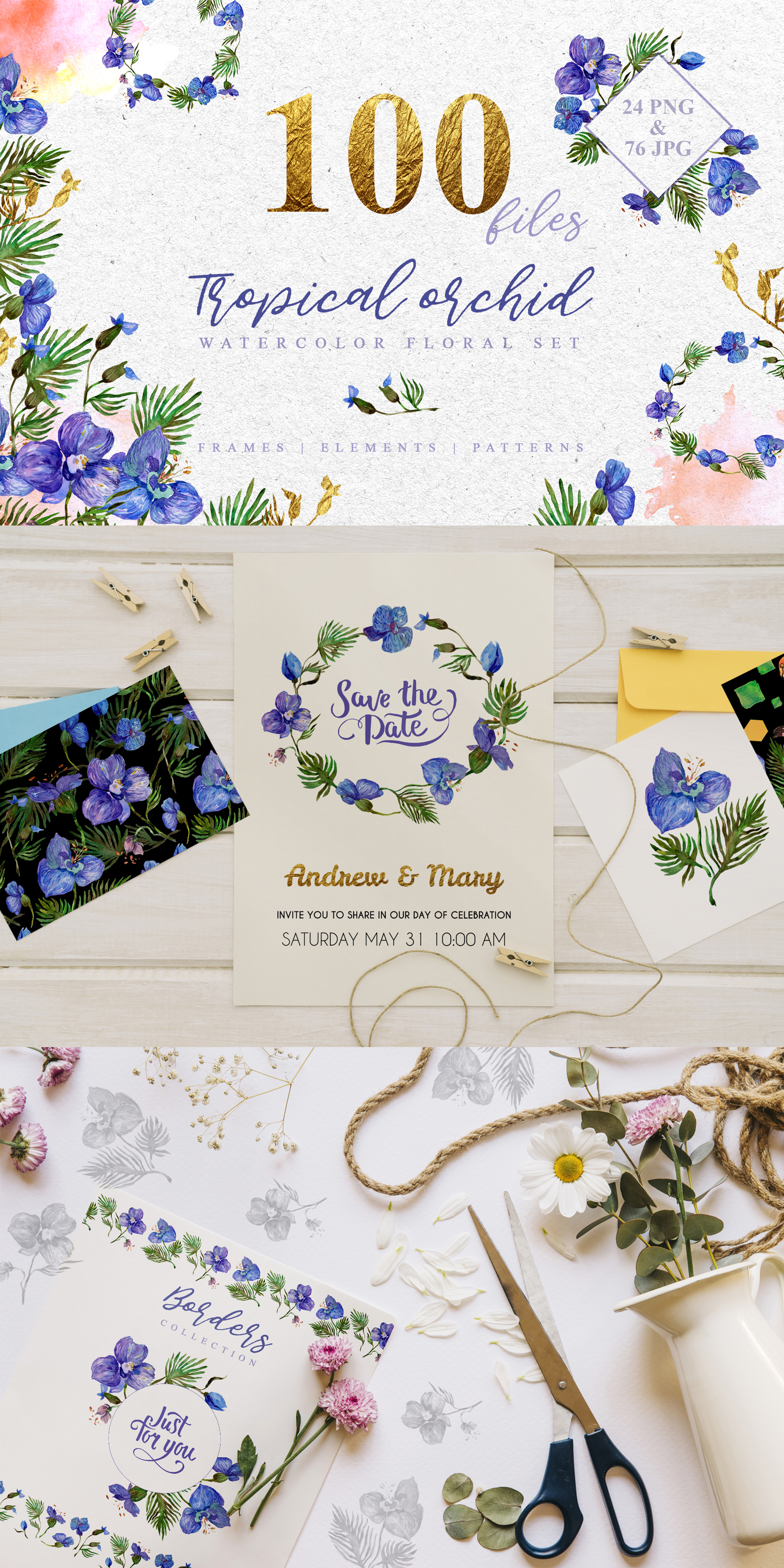 Tropical orchid Watercolor png clipart of 100 files. Ideal material for DIY, wedding invitations, greeting cards, quotes, blogs, posters and more.