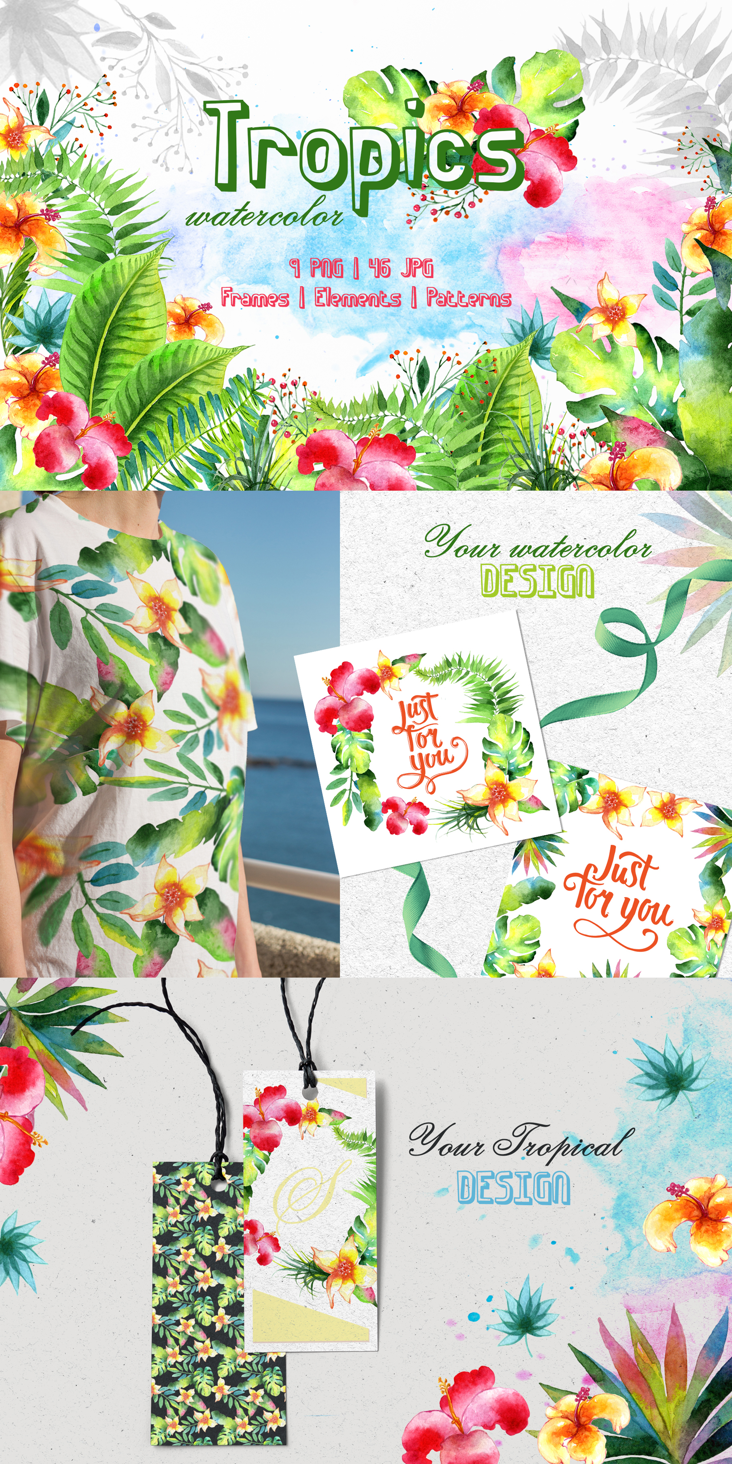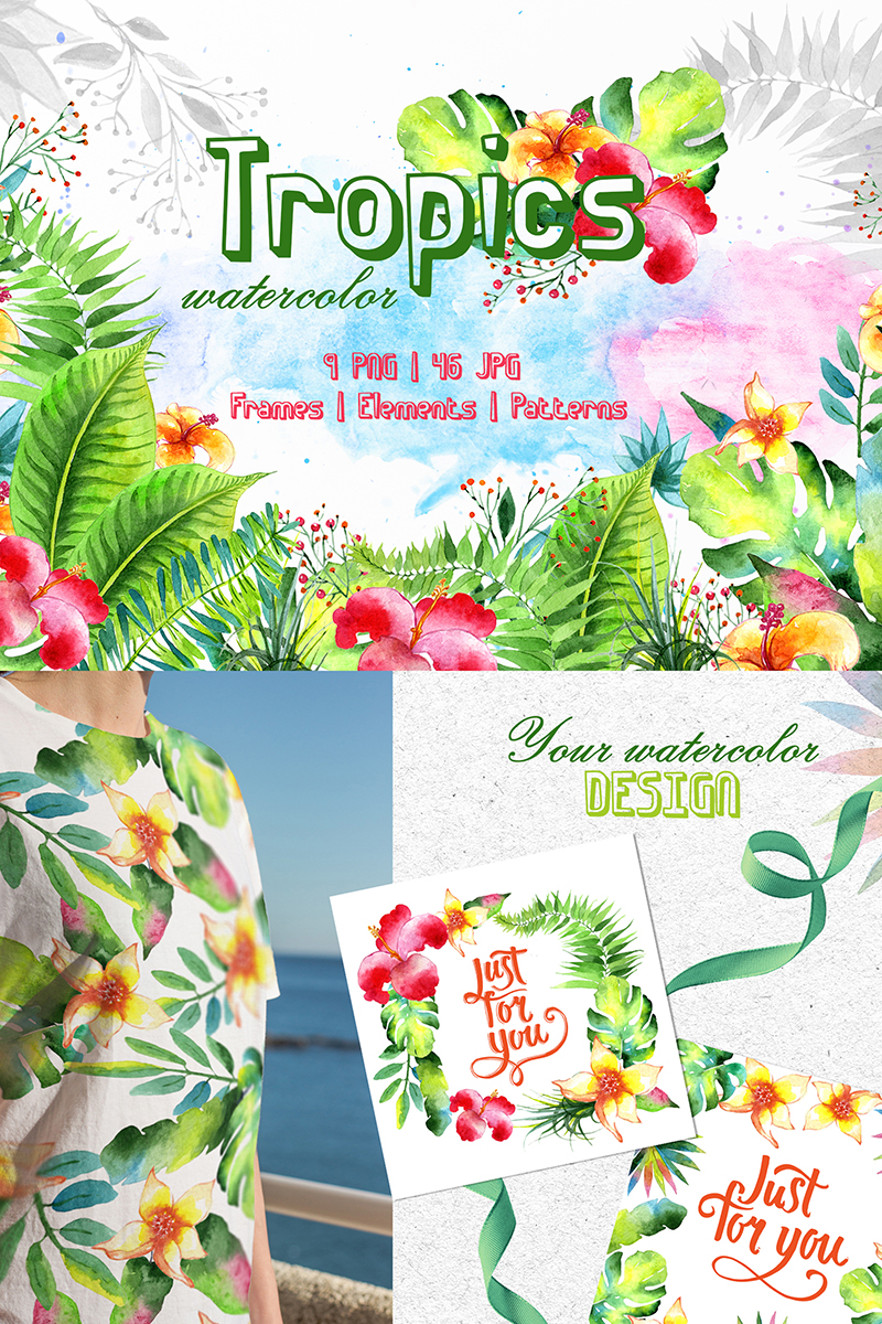 Tropics Watercolor png clipart of 55 files. Ideal material for DIY, wedding invitations, greeting cards, quotes, blogs, posters and more.