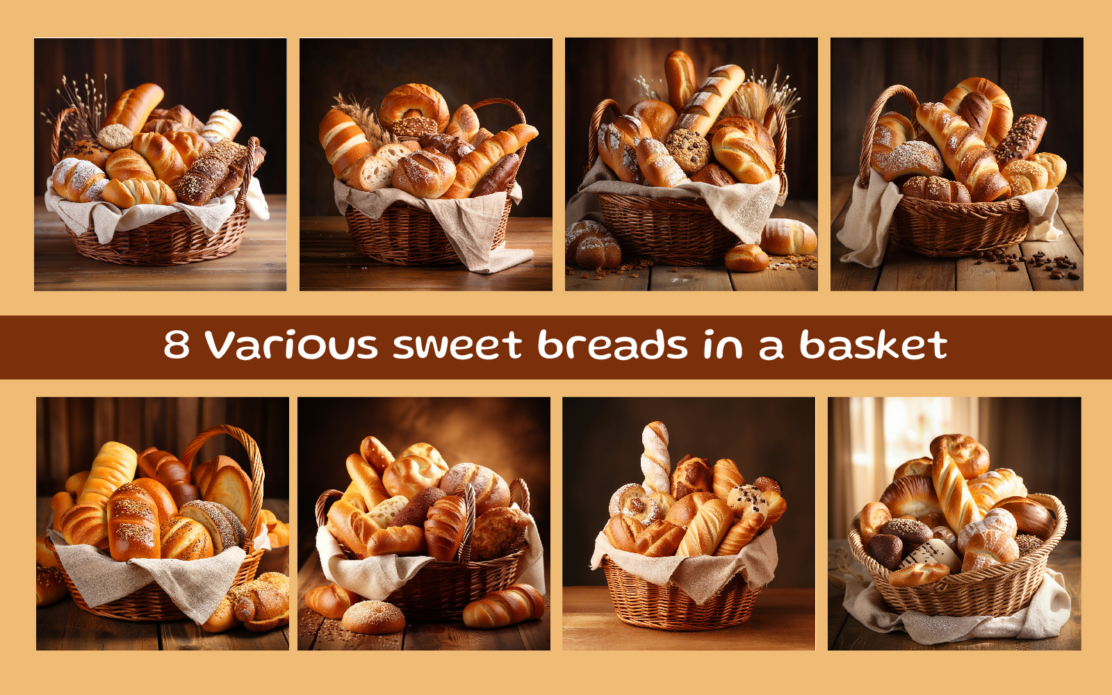 Various sweet breads in a basket. Enjoy the art of baking with our pastry and bread AI images. This delightful artwork captures the essence of this classic pastry, showcasing its golden crust and soft, fluffy texture. Perfect for bakery menus, recipe books, or culinary-themed designs, social media post, banner and etc. it adds a touch of artisanal charm to your creative projects.