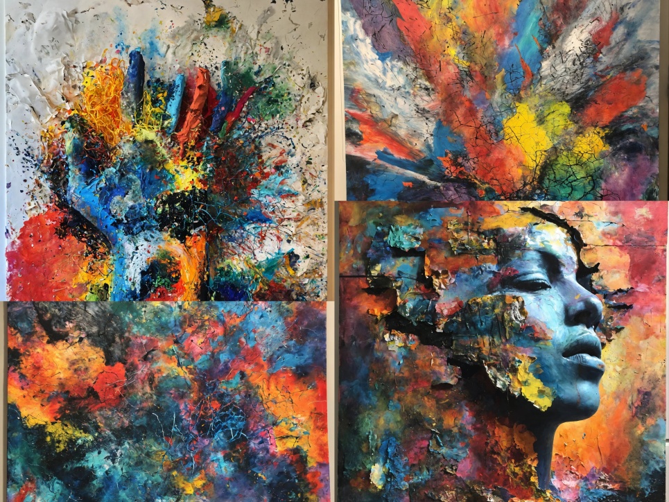 Welcome to a mesmerizing journey through digital creativity! This stunning AI-generated artwork represents the beautiful collision between human imagination and artificial intelligence. Each piece in this four-panel collection tells a story of explosive creativity - from the dynamic hand reaching through swirling colors to the serene profile emerging from a kaleidoscope of hues.