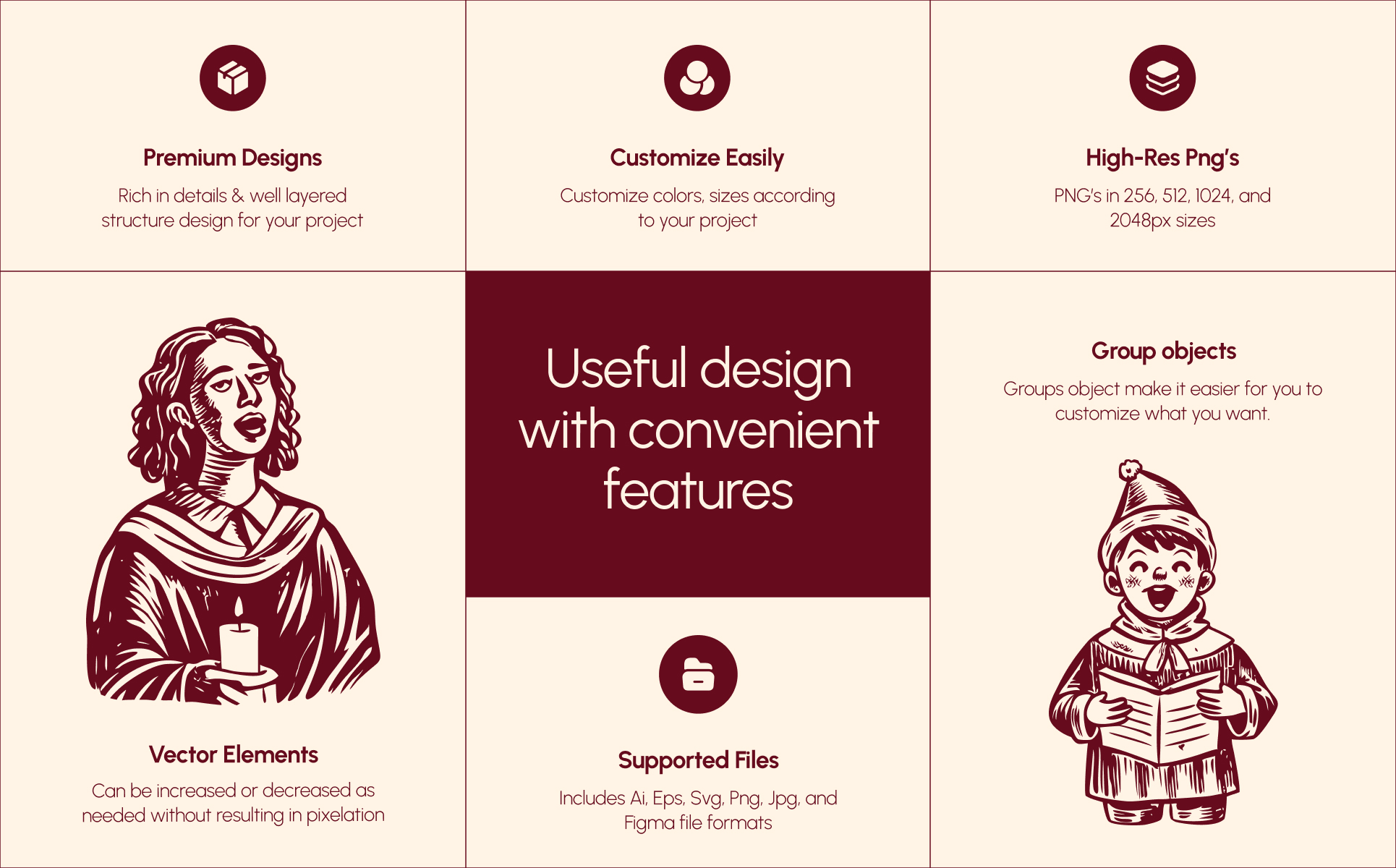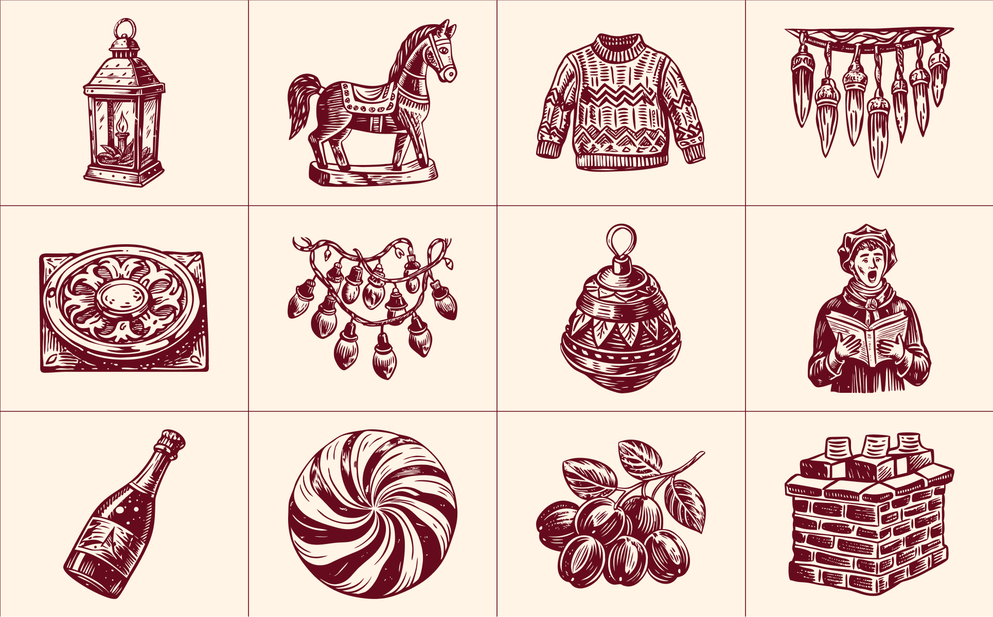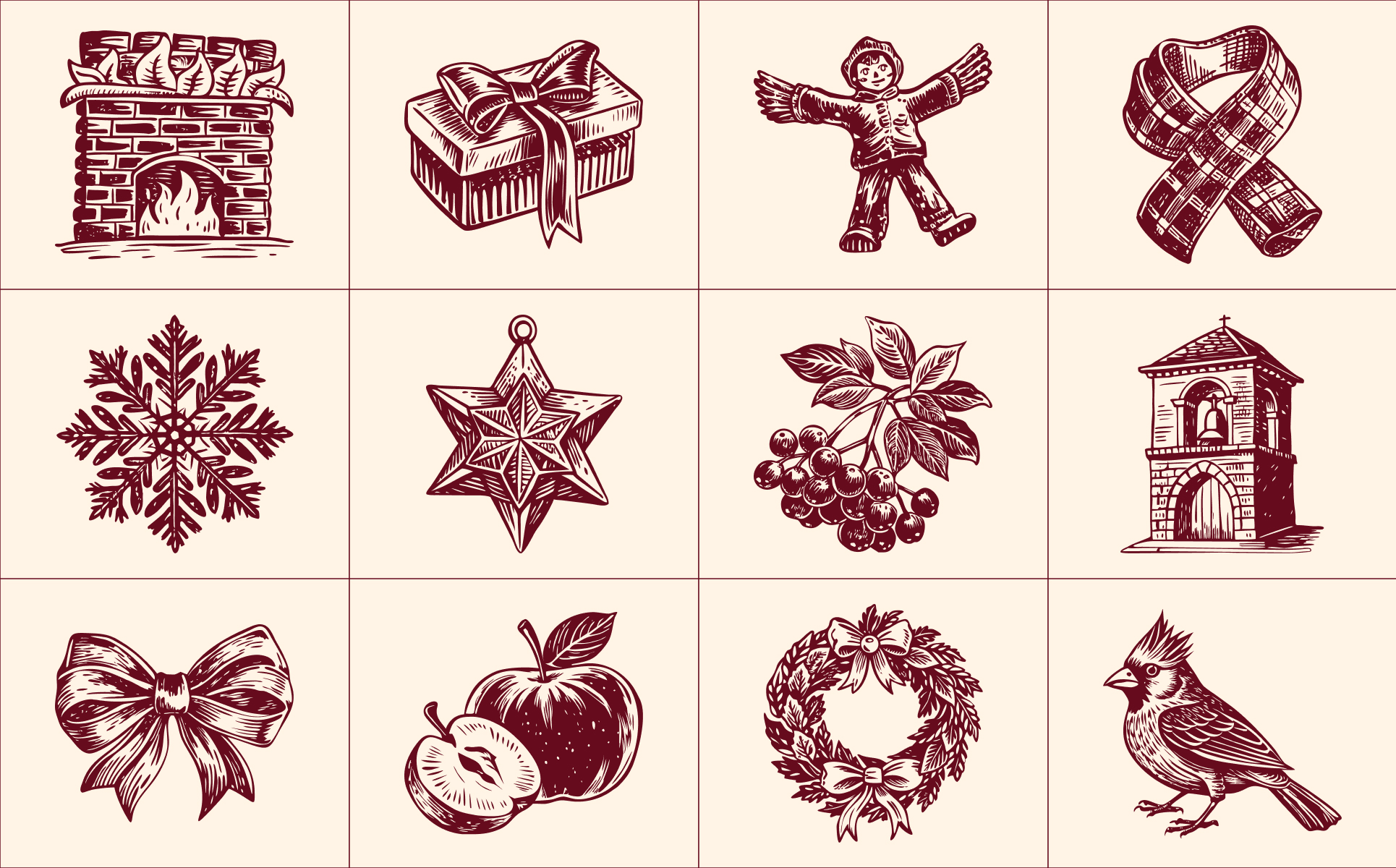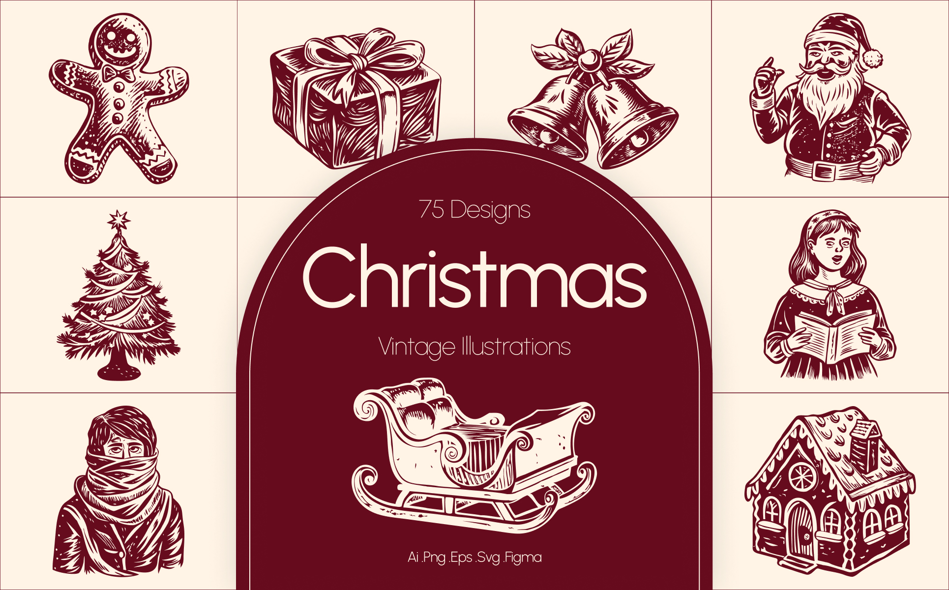 Step into a world of nostalgic wonder with this heartwarming set of Vintage Christmas Illustrations. Brimming with cozy charm, each piece is lovingly crafted to capture the magic of holiday traditions, twinkling lights, joyful characters, festive treats, and timeless decor. Whether you're designing holiday cards, branding seasonal products, or adding a retro touch to your creative projects, this collection brings the spirit of a classic Christmas to life in the most delightful way.