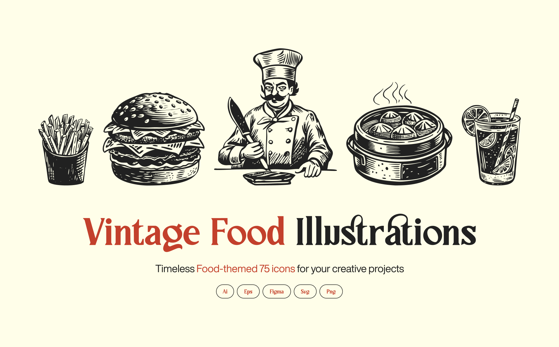 Step into a world of timeless flavour with this vintage food illustration set, a lovingly crafted collection of retro style food art. Whether you're designing menus, packaging, cookbooks, or creative blogs, these illustrations add a unique, nostalgic touch. From juicy fruits to global cuisine favorites, each element is illustrated for designers, food bloggers, and creatives who crave a taste of the past, served fresh and ready to use!
