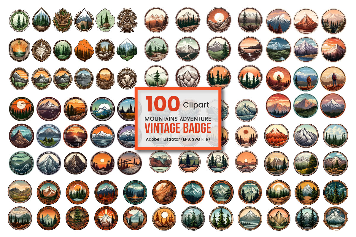 Collection of Vintage mountain adventure badge clipart bundle, High Quality Mountain Adventure Sublimation Design. Graphics for t-shirt prints, apparel, stickers, posters and other uses.