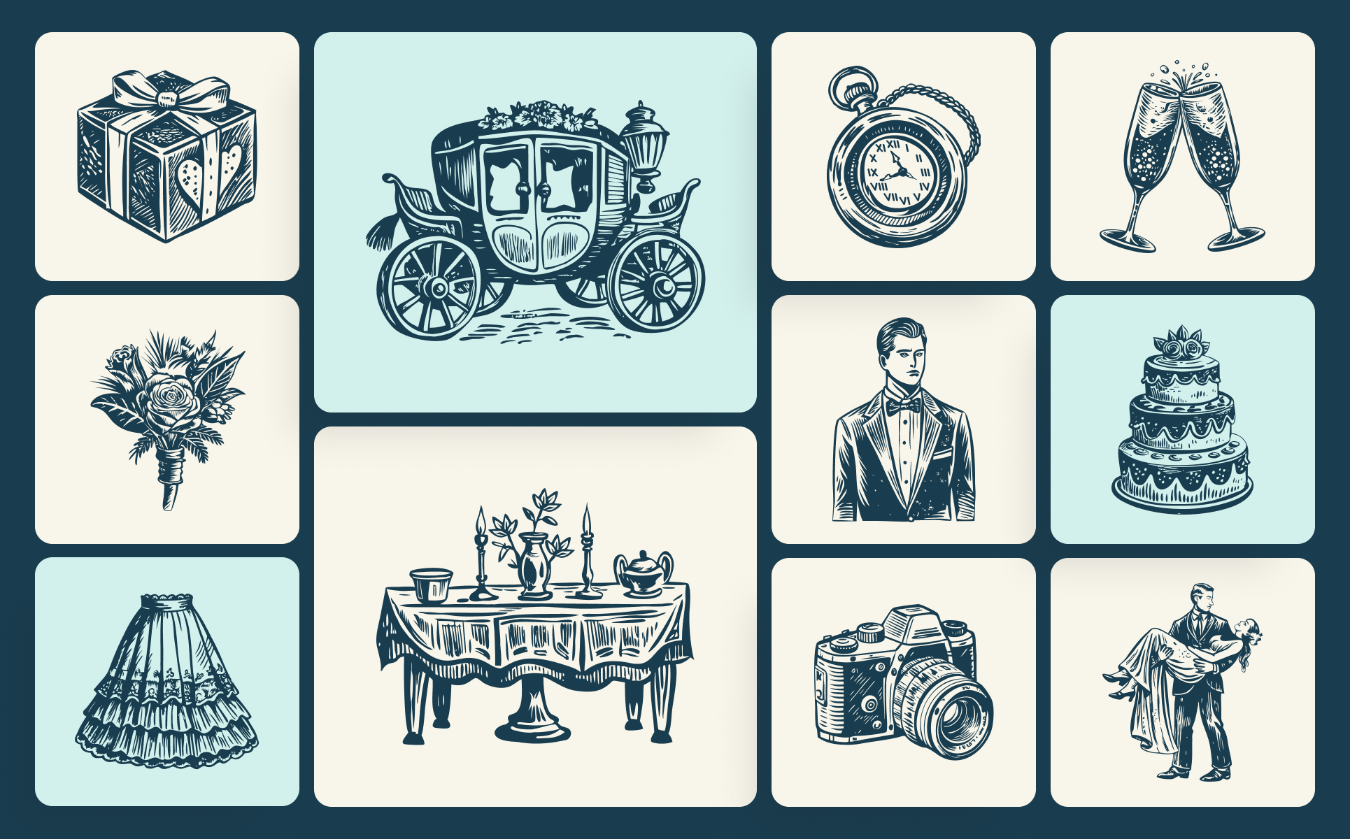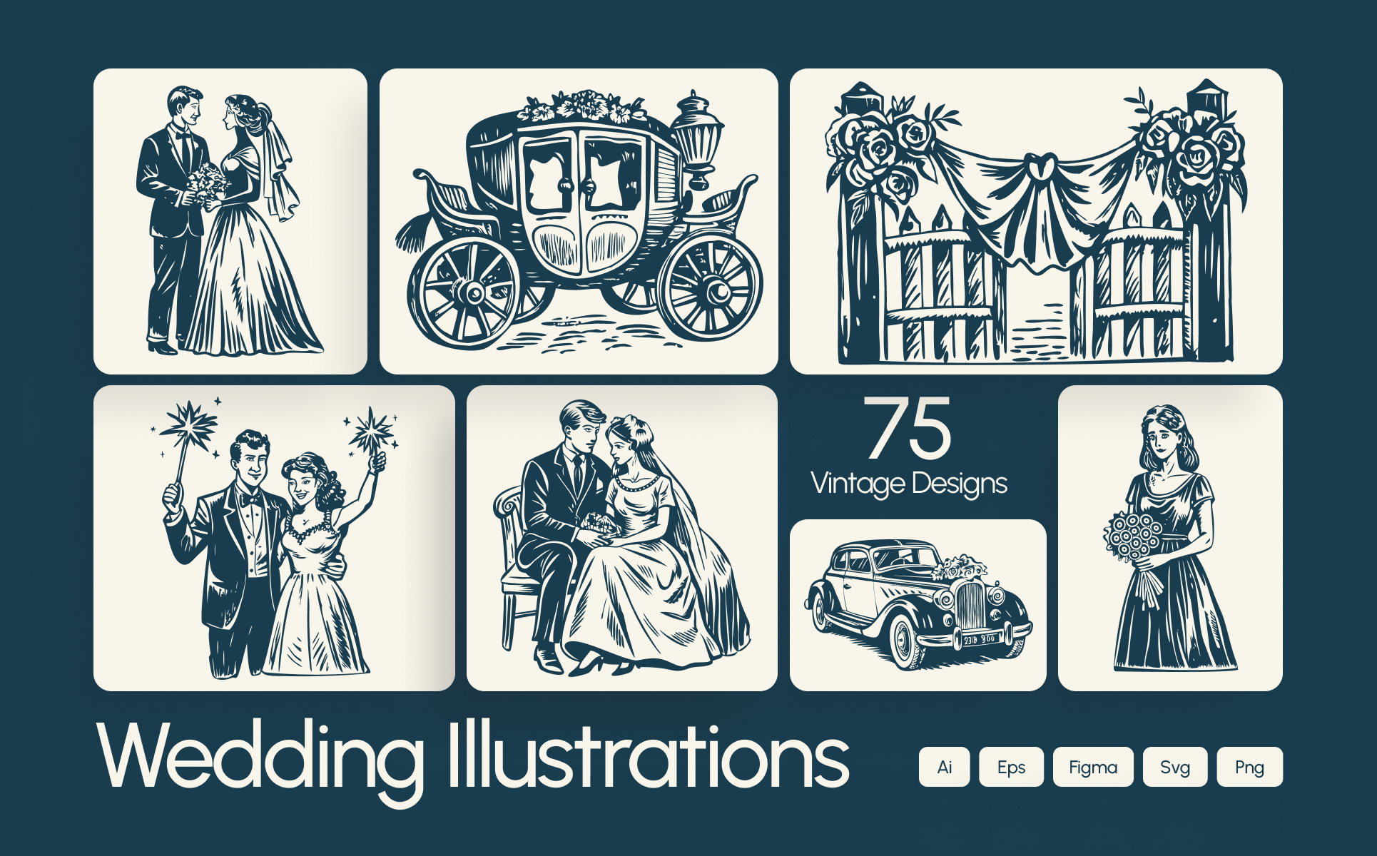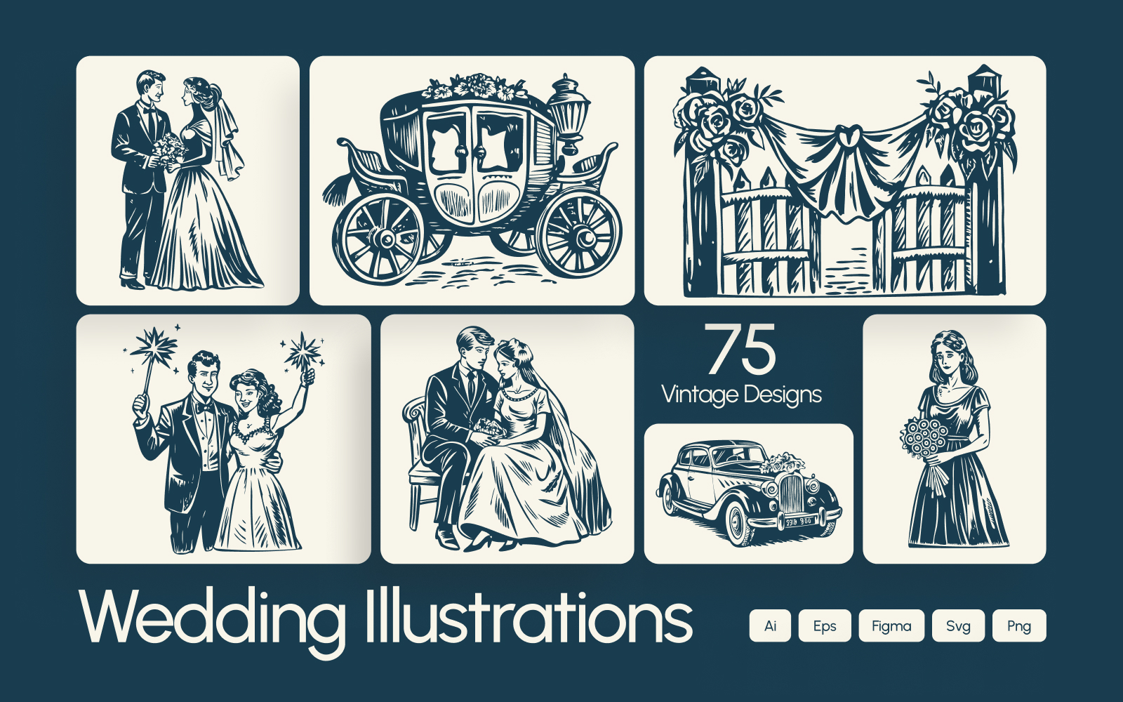 Make your wedding designs unforgettable with this Vintage Wedding Illustration Set! Packed with charming, hand-drawn elements, this collection captures the elegance and romance of classic weddings. Whether you're designing invitations, greeting cards, wedding decor, or branding materials, these illustrations add a timeless touch. Let love and artistry come together in your creative work!