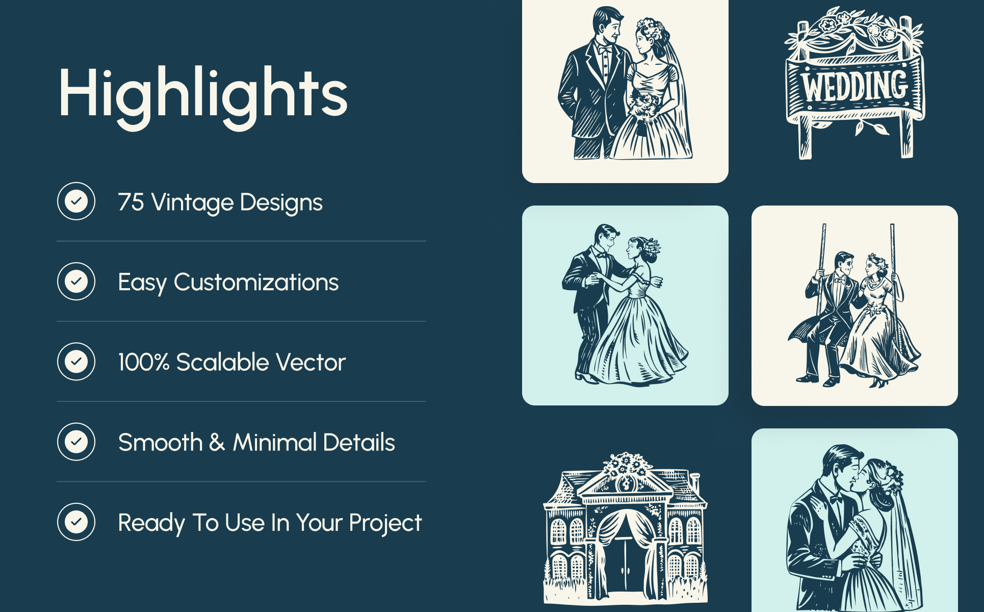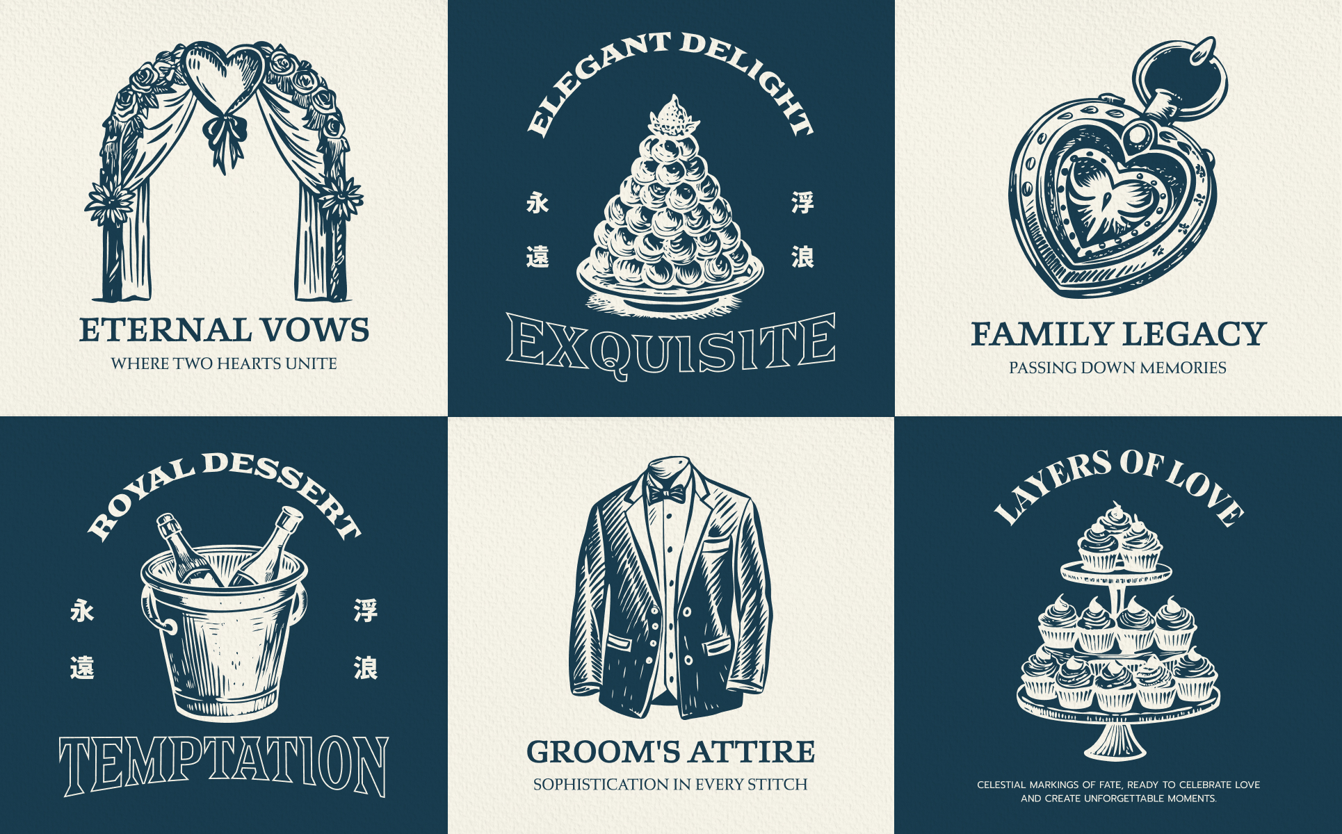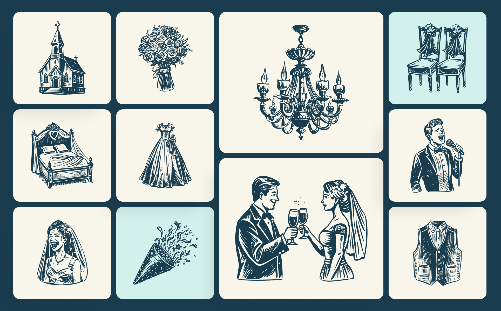 Make your wedding designs unforgettable with this Vintage Wedding Illustration Set! Packed with charming, hand-drawn elements, this collection captures the elegance and romance of classic weddings. Whether you're designing invitations, greeting cards, wedding decor, or branding materials, these illustrations add a timeless touch. Let love and artistry come together in your creative work!