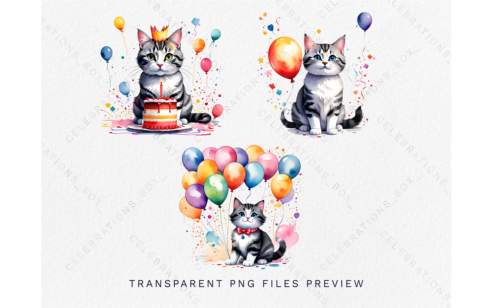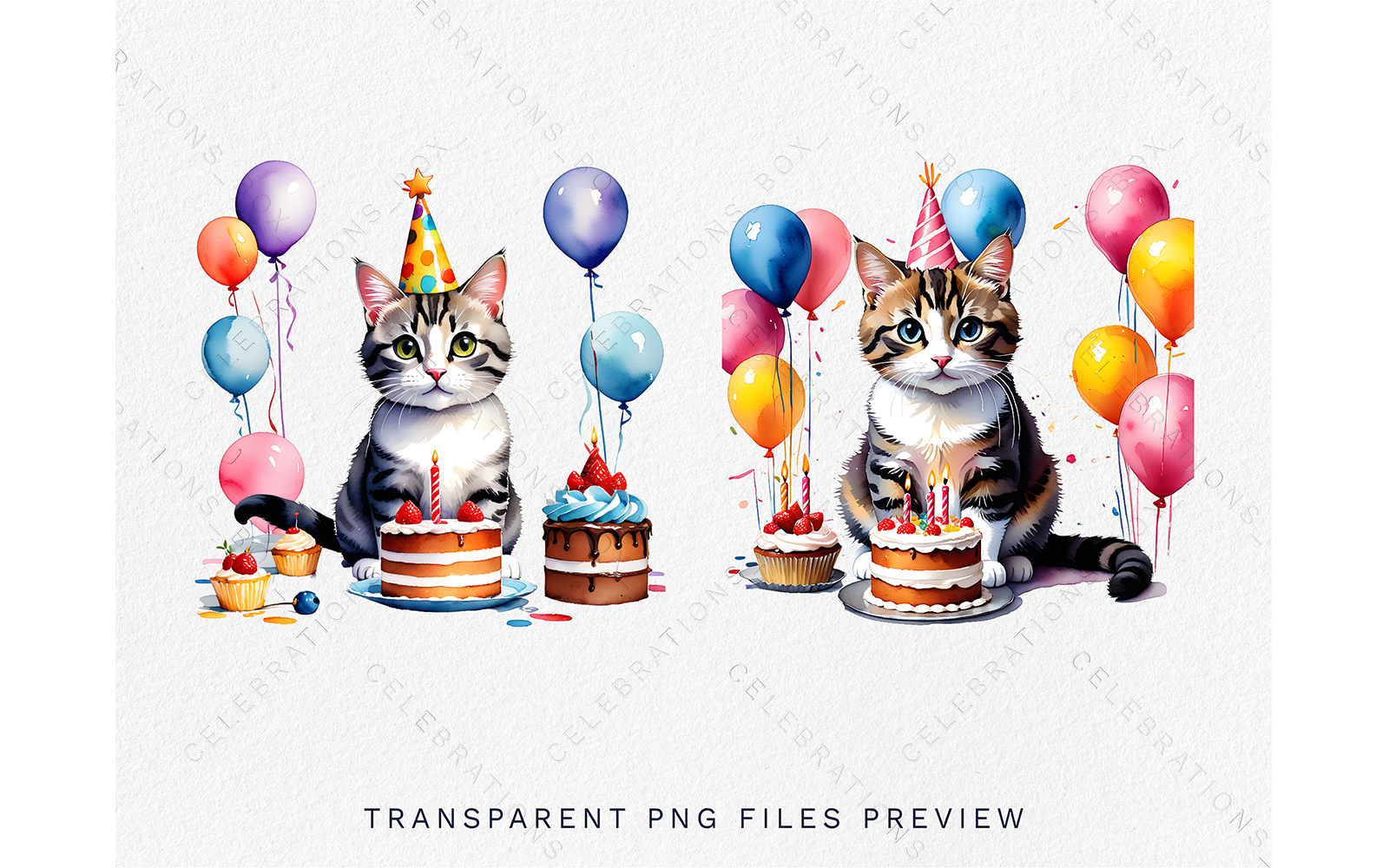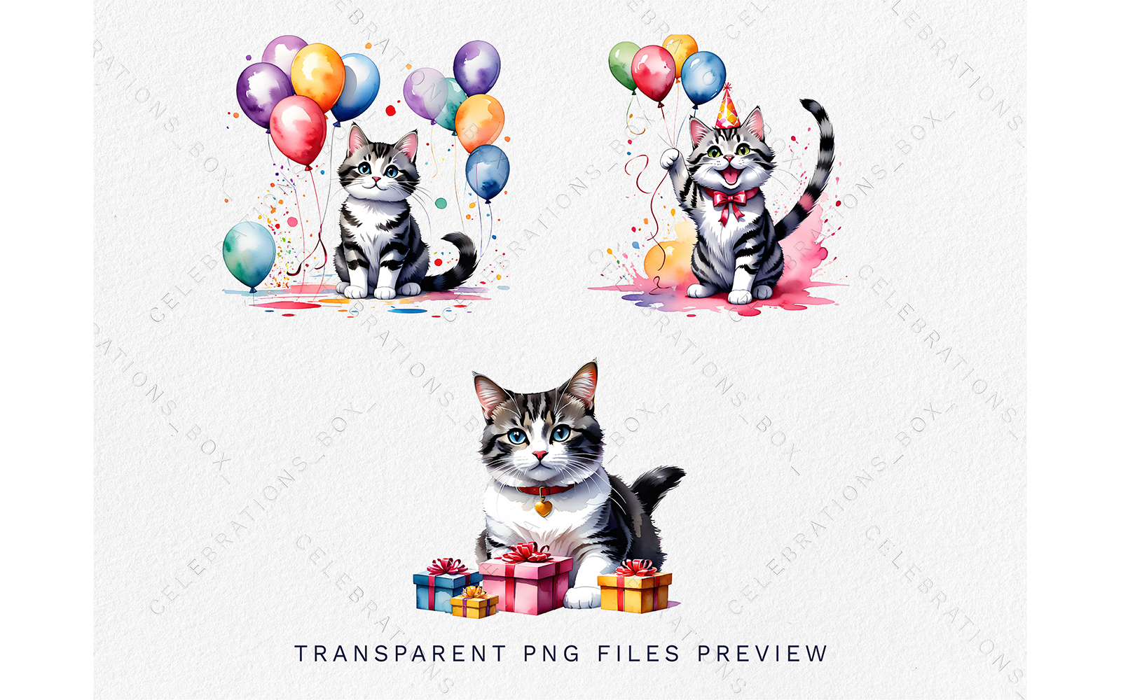 Watercolor Cat Birthday Clipart Graphics Bundle, Cute Kitten Cat Clipart Bundle, Watercolor Clipart Illustration