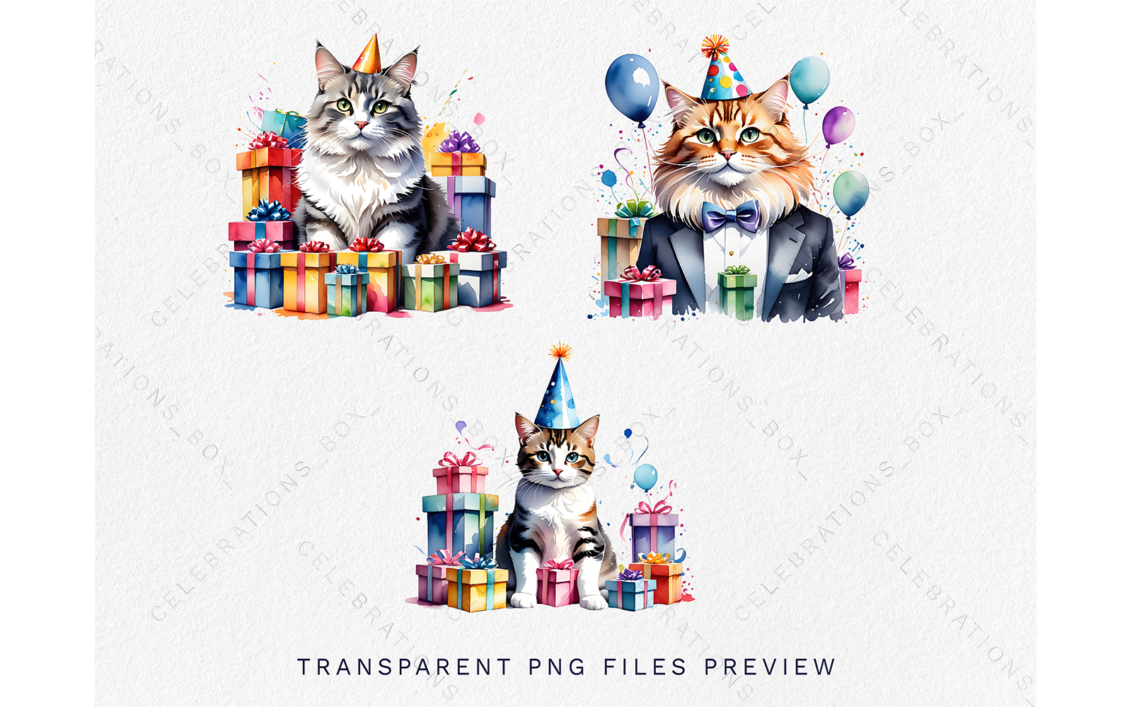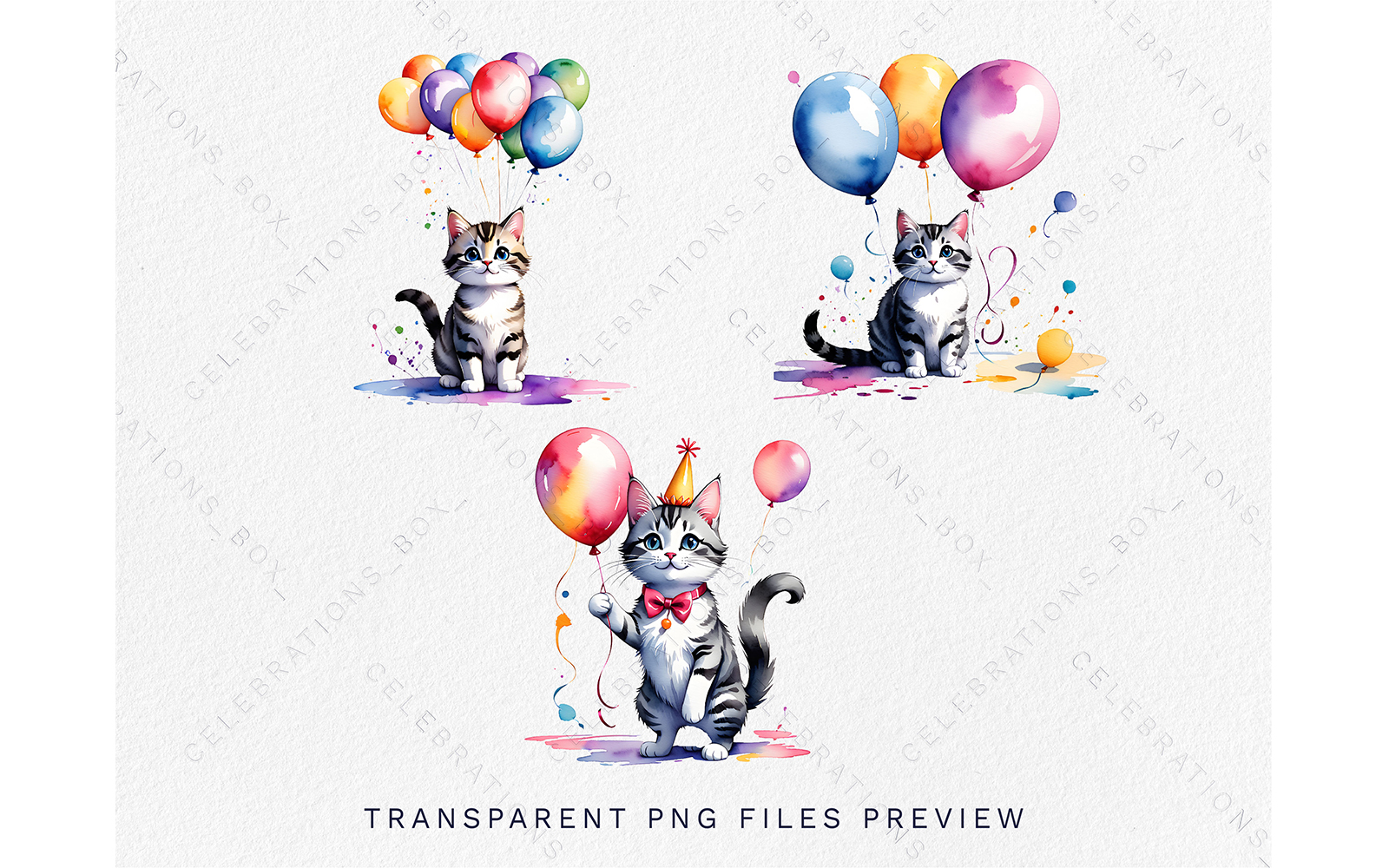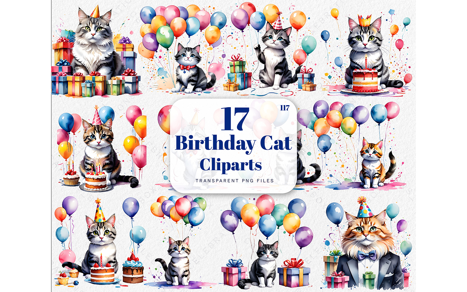 Watercolor Cat Birthday Clipart Graphics Bundle, Cute Kitten Cat Clipart Bundle, Watercolor Clipart Illustration