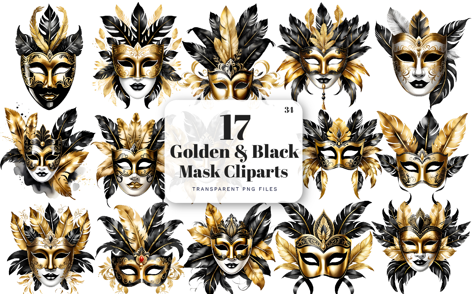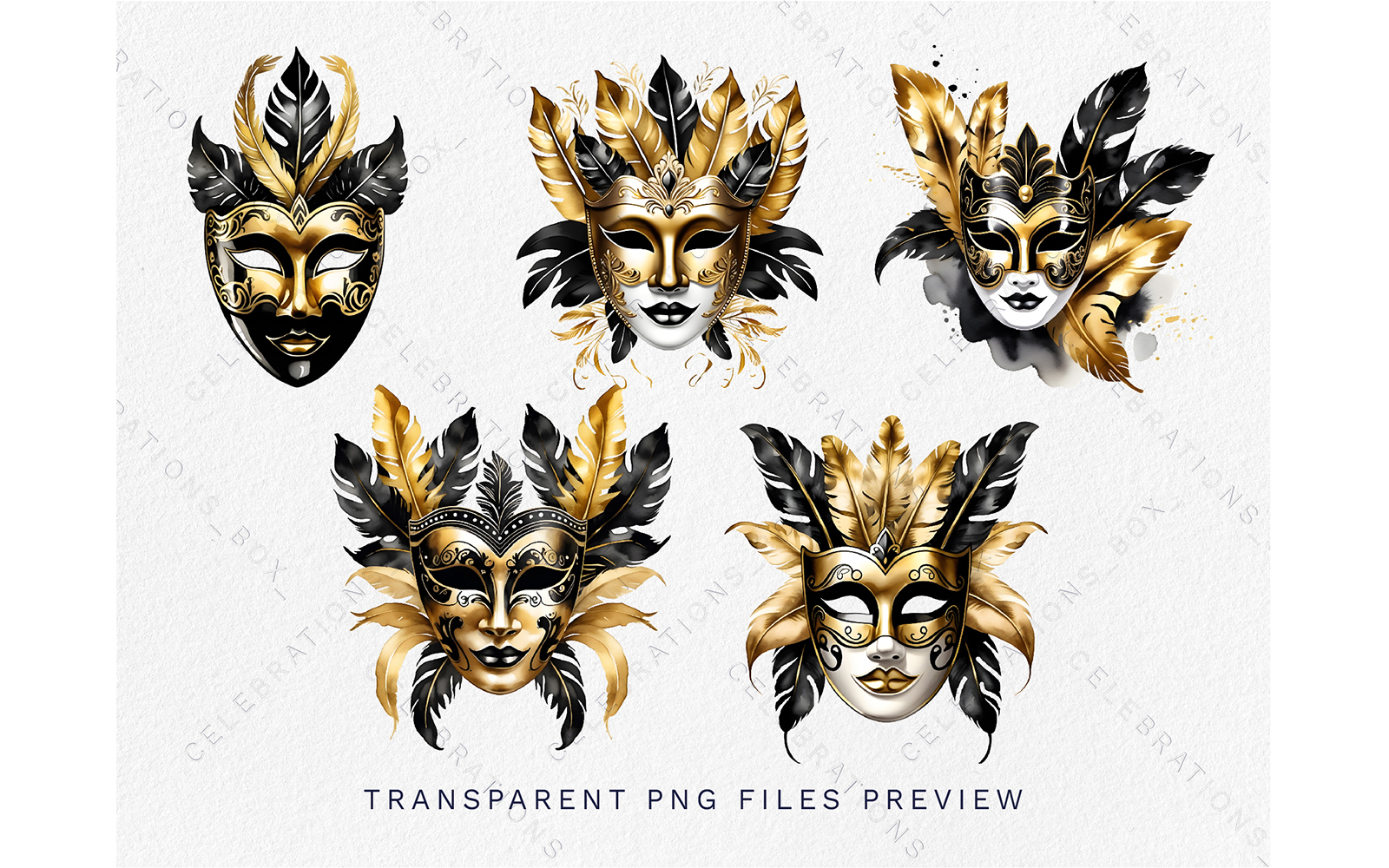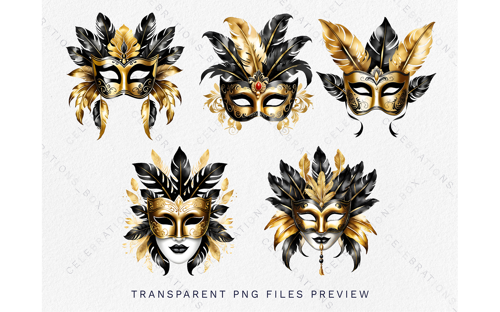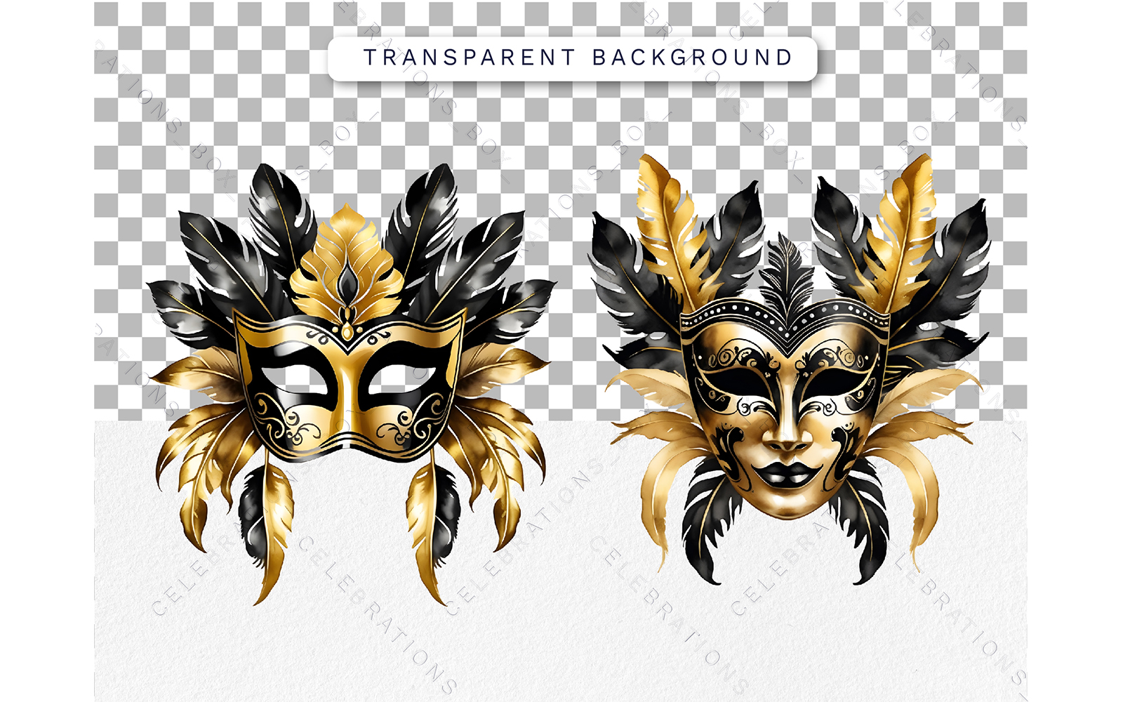Watercolor Golden Black Masquerade Carnival Masks Clipart Illustration