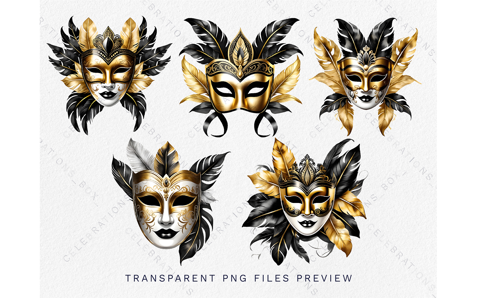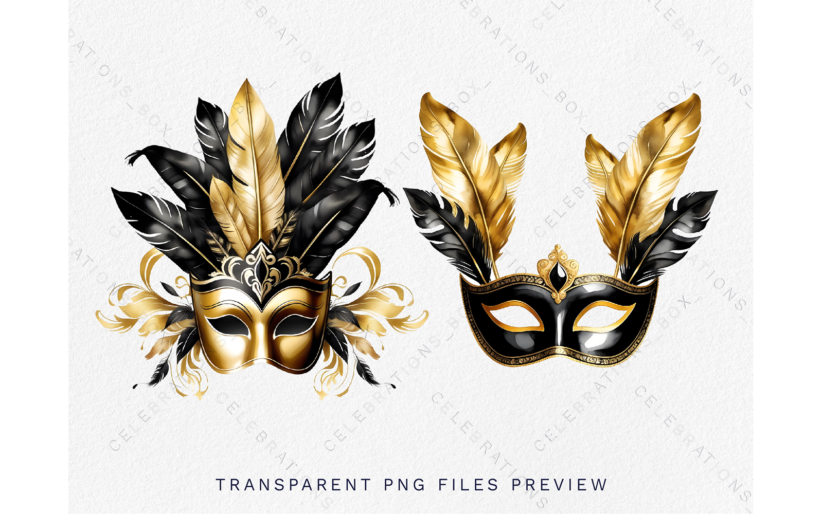 Bring the Brasilian carnival to life with our Watercolor Golden Black Masquerade Mask Carnival clipart bundle. Get ready to let your imagination run wild and join in on the fun and energy of one of the world's most famous celebrations. Elevate your designs, impress your clients, and stand out from the crowd with this collection of graphics that will transport you straight to the heart of the Rio de Janeiro Carnival.