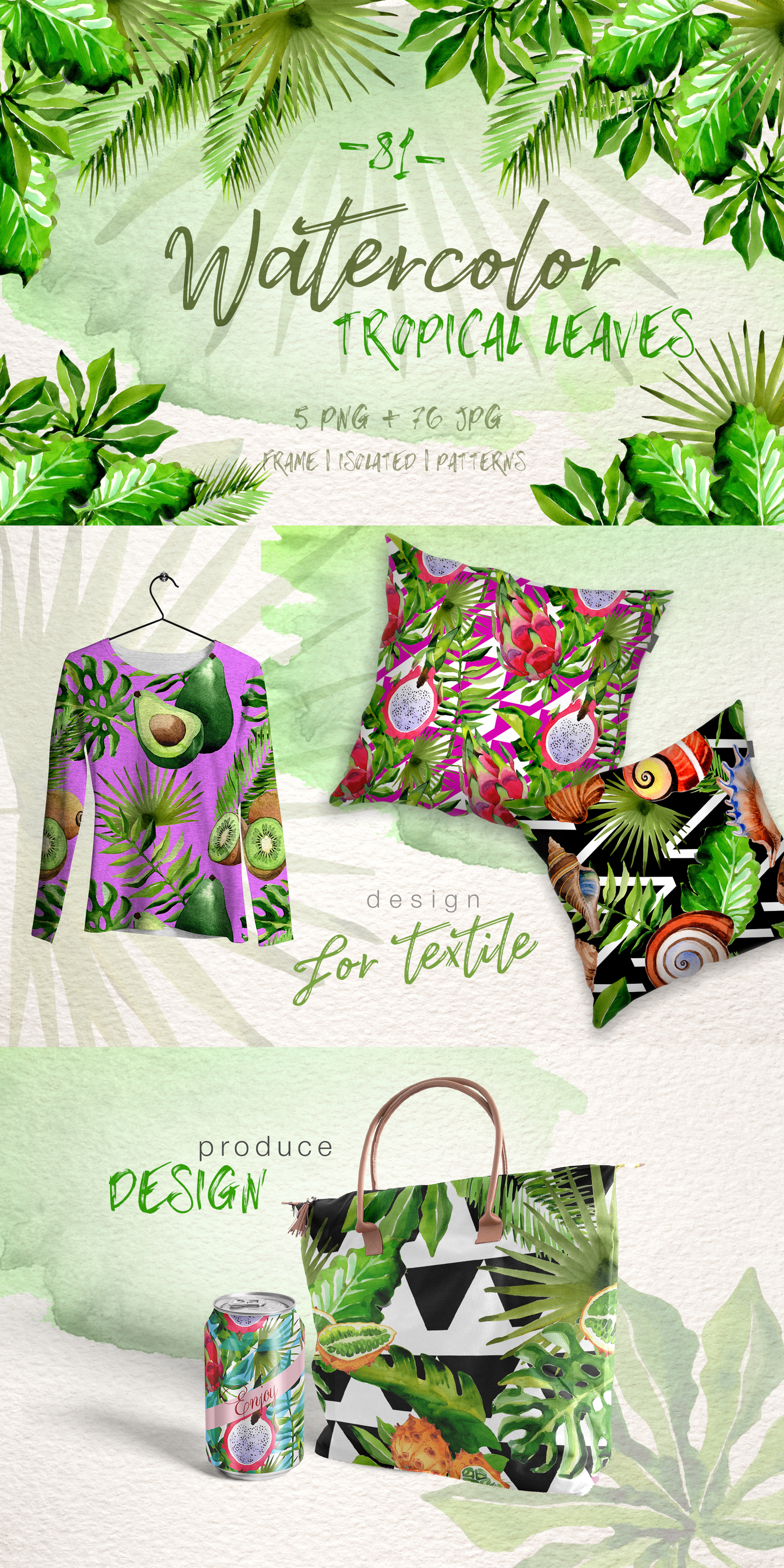 Watercolor tropical green leaves set of 81 files. Ideal material for DIY, wedding invitations, greeting cards, quotes, blogs, posters and more.