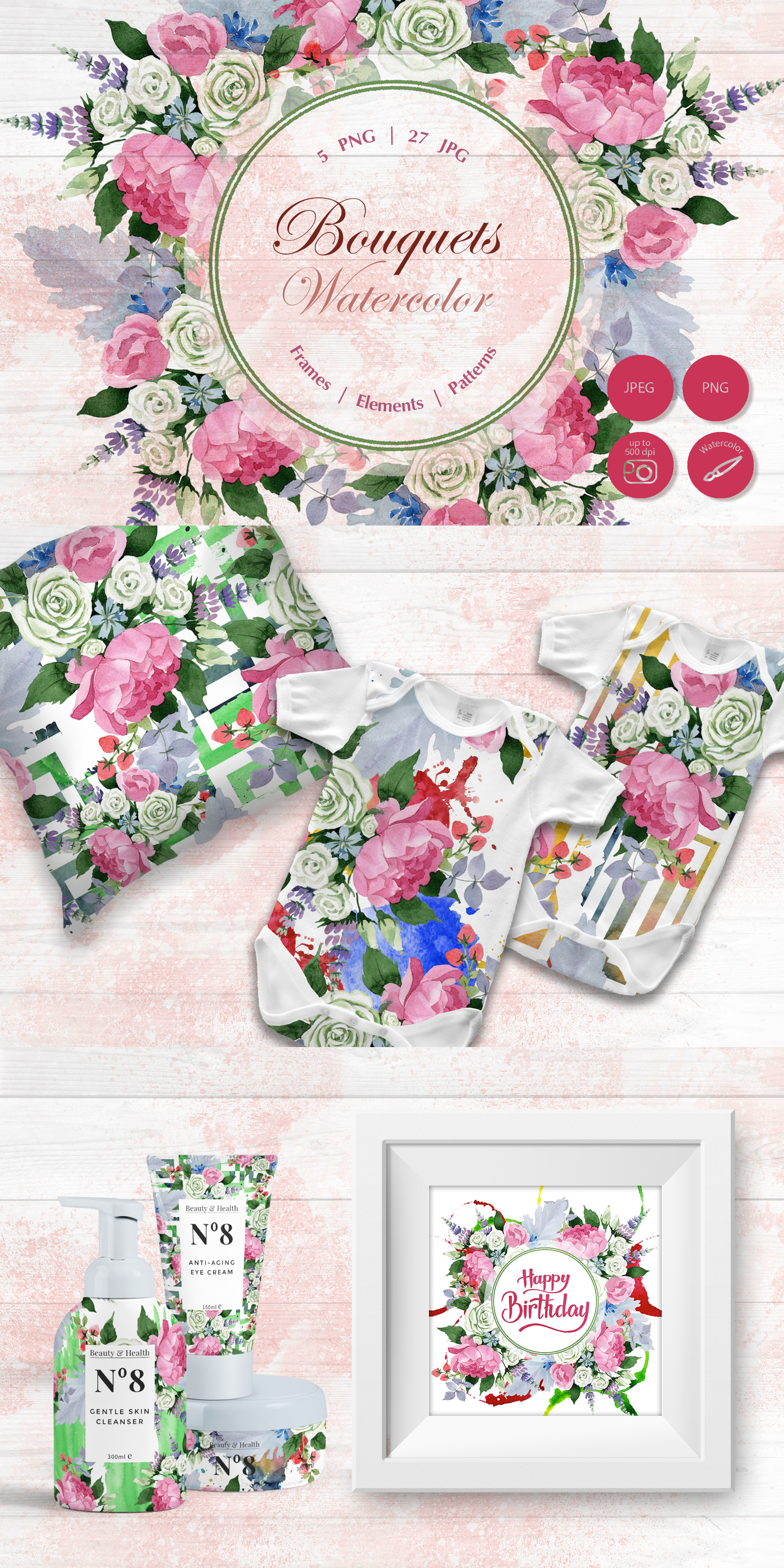 Elements are painted by hand and every image is a separate file. The graphics are a PNG file, 600 dpi, without background. Patterns and Frames are JPG size 3500x3500px.