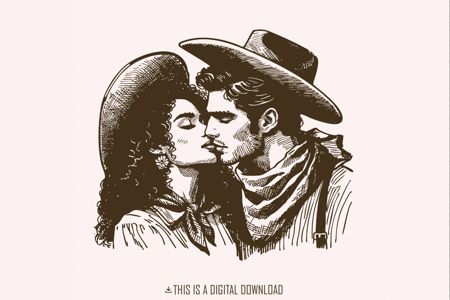 Western Cowboy Cowgirl Kiss PNG, Vintage Illustration, Digital Download, Trendy Western Valentine,