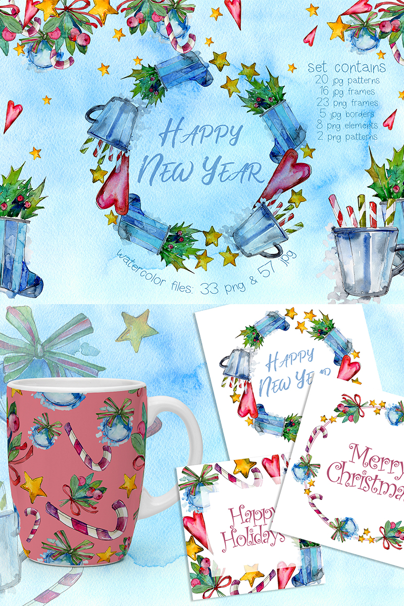 Christmas winter holiday symbol in a watercolor style of 90 files. Aquarelle christmas card for background, texture, wrapper pattern, frame or border. Ideal material for DIY, greeting cards, quotes, blogs, menu, posters and more.