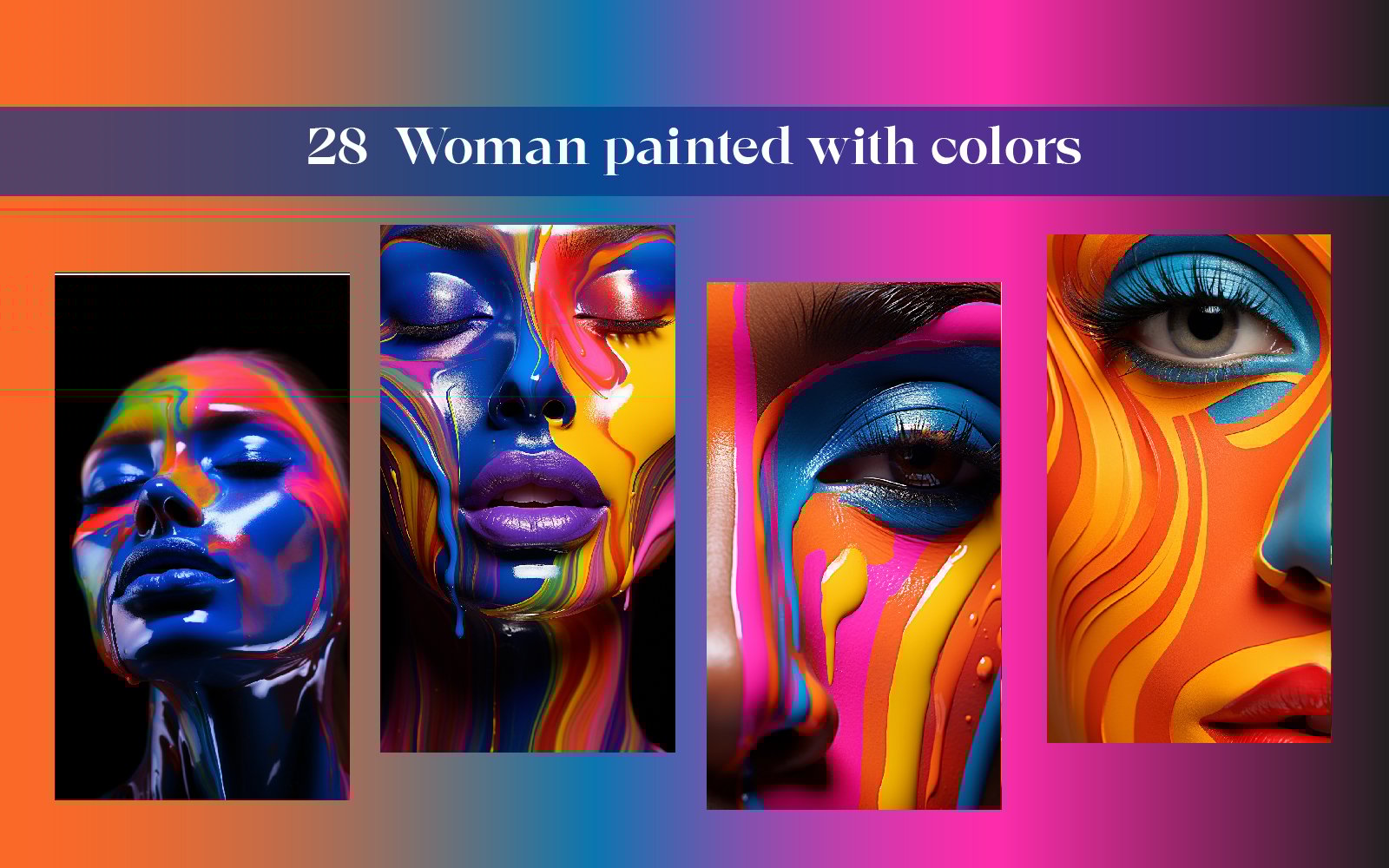 Woman painted with colors. AI-generated images of female exhibit remarkable creativity and diversity, showcasing a myriad of empowered heroines from various backgrounds and cultures. These images capture the essence of strength, resilience, and determination, fashion, beauty, art, ads, science, robot, technology, portraying female superheroes in dynamic poses and vibrant costumes that inspire awe and admiration.