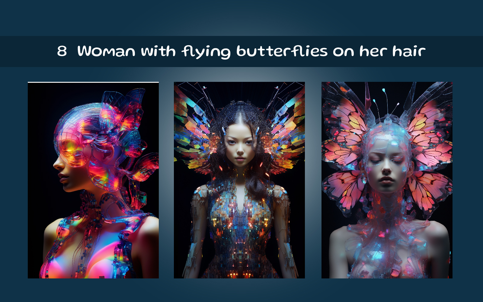 Woman with flying butterflies on her hair. AI-generated images of female exhibit remarkable creativity and diversity, showcasing a myriad of empowered heroines from various backgrounds and cultures. These images capture the essence of strength, resilience, and determination, fashion, beauty, art, ads, science, robot, technology, portraying female superheroes in dynamic poses and vibrant costumes that inspire awe and admiration.