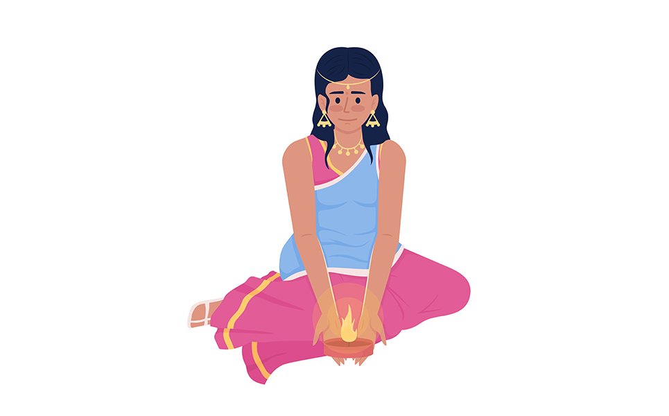 Young girl holding diwali candle semi flat color vector character. Festival of light. Editable figure. Full body person on white. Simple cartoon style illustration for web graphic design and animation