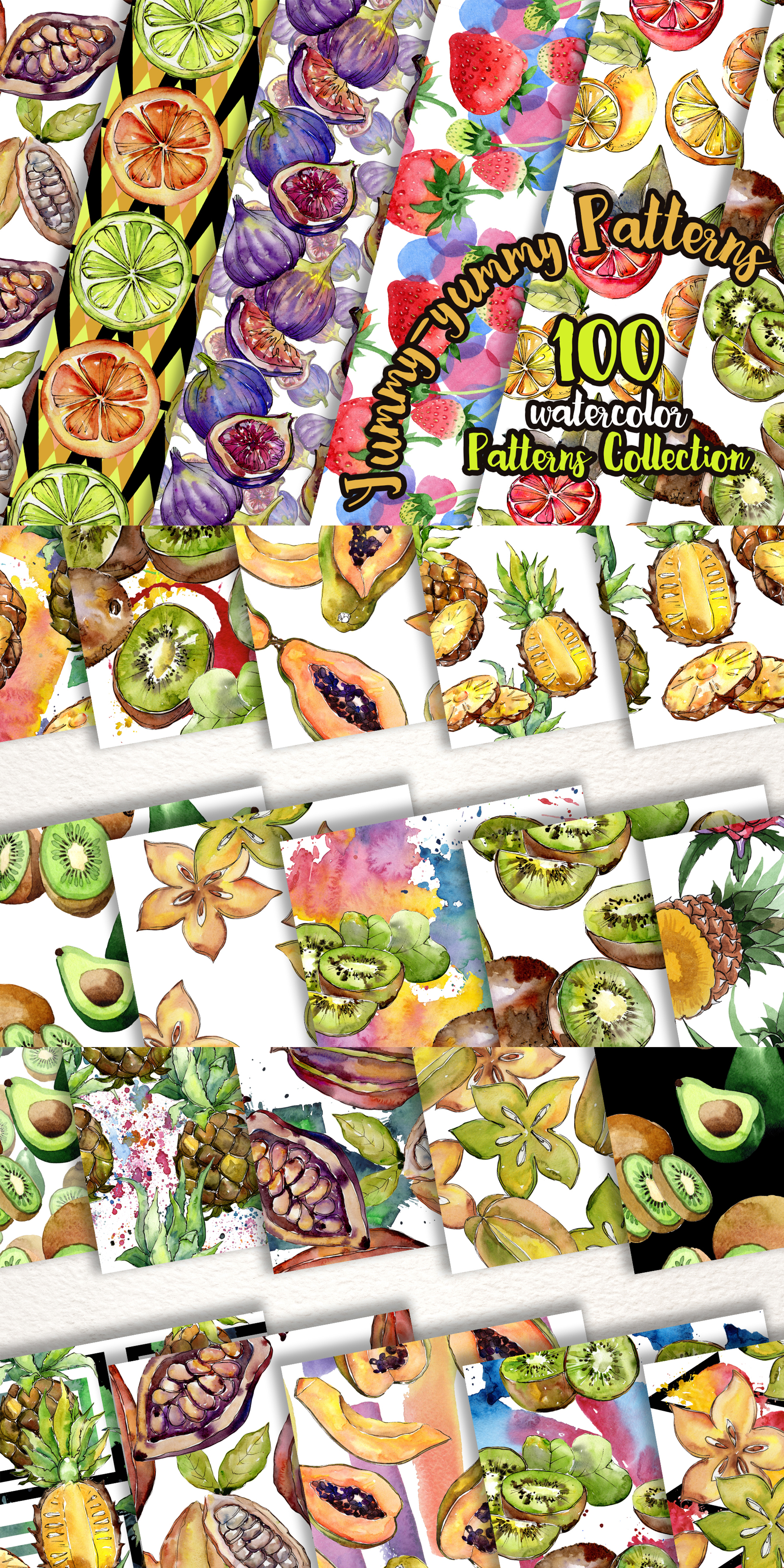 Patterns fruits collection watercolor of 100 files. Ideal material for DIY, greeting cards, quotes, blogs, menu, posters and more.