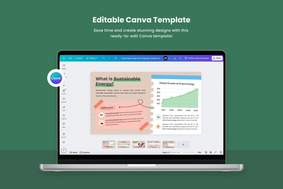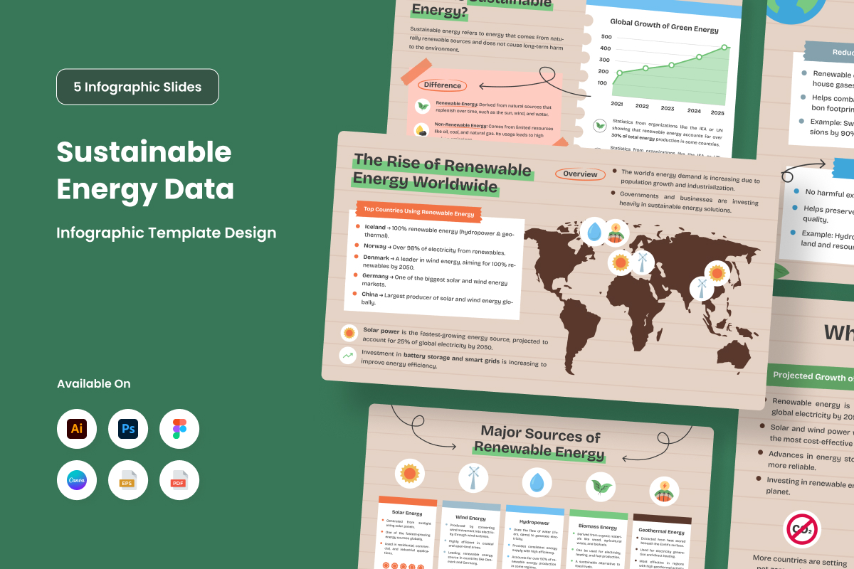 This professionally designed infographic delivers clear and engaging data visualization on sustainable energy. Featuring a modern layout, eco-friendly color palette, and structured visuals, it simplifies complex information for reports, presentations, and campaigns. Ideal for designers, businesses, and sustainability advocates.