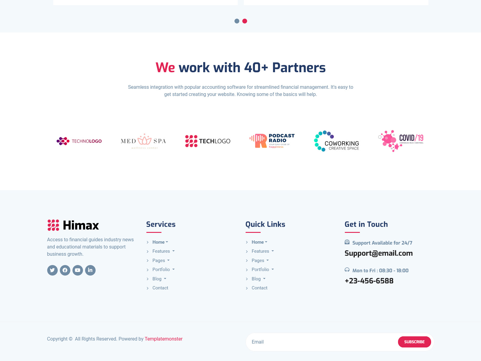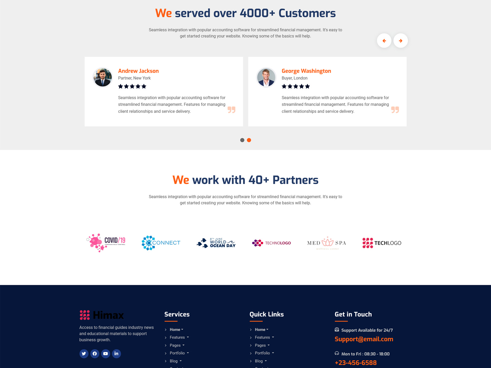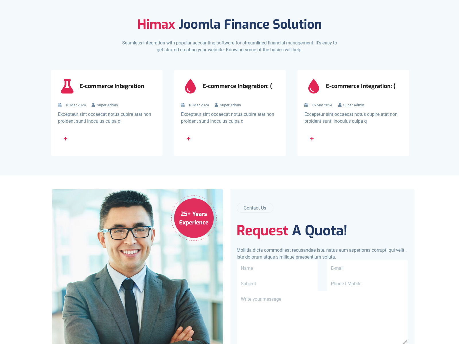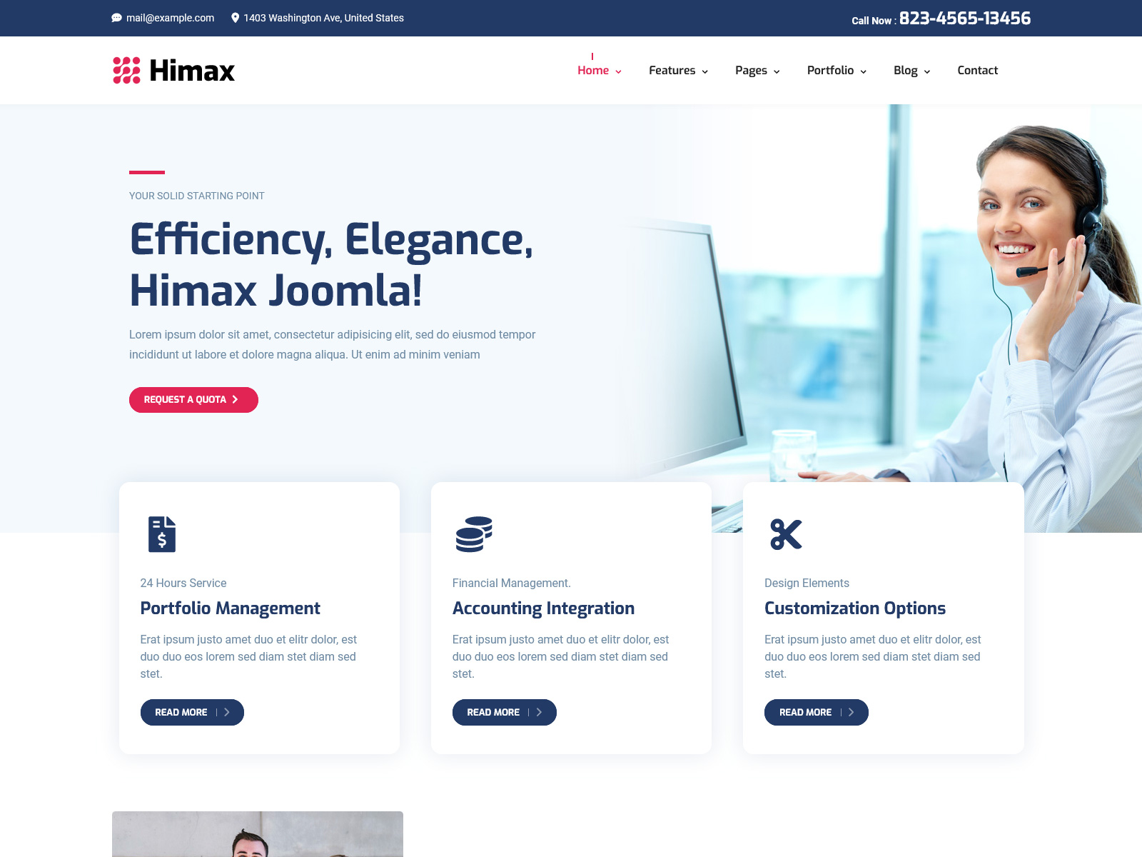 Experience the epitome of professionalism and sophistication with the Himax Joomla Business and Finance template. Tailored specifically for financial institutions, consulting firms, and corporate entities, Himax offers a sleek and modern design coupled with robust functionality. With its intuitive layout and customizable features, effortlessly showcase your services, team members, testimonials, and portfolio. Empower your online presence and establish credibility with Himax Joomla Business and Finance template.