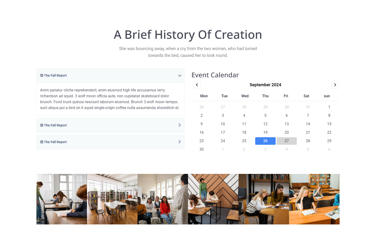 The theme offers all the page structures an educational institution may need. It includes sections for class schedules, teaching staff, student success stories, event announcements, blogs, and news pages. This way, you'll have dedicated spaces to effectively showcase all your institution's services.