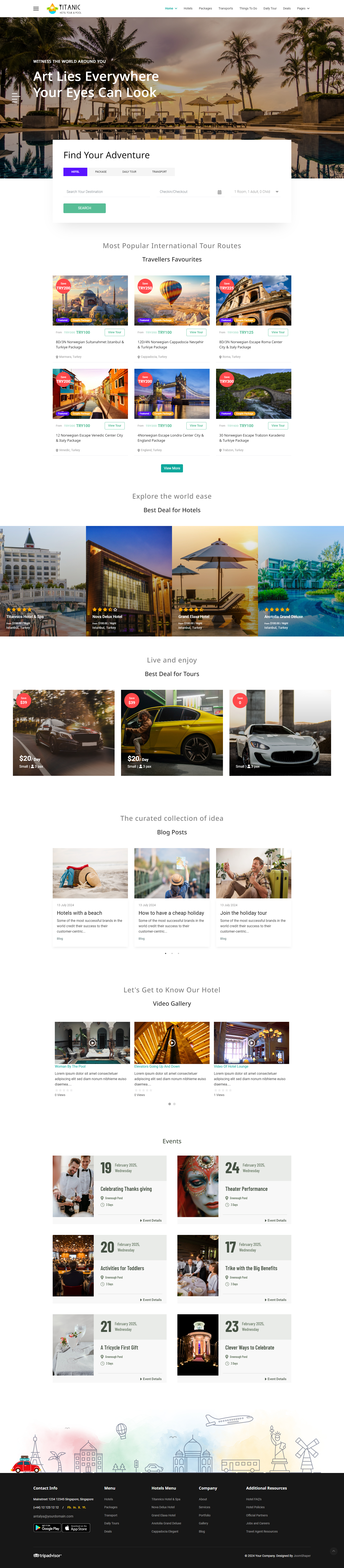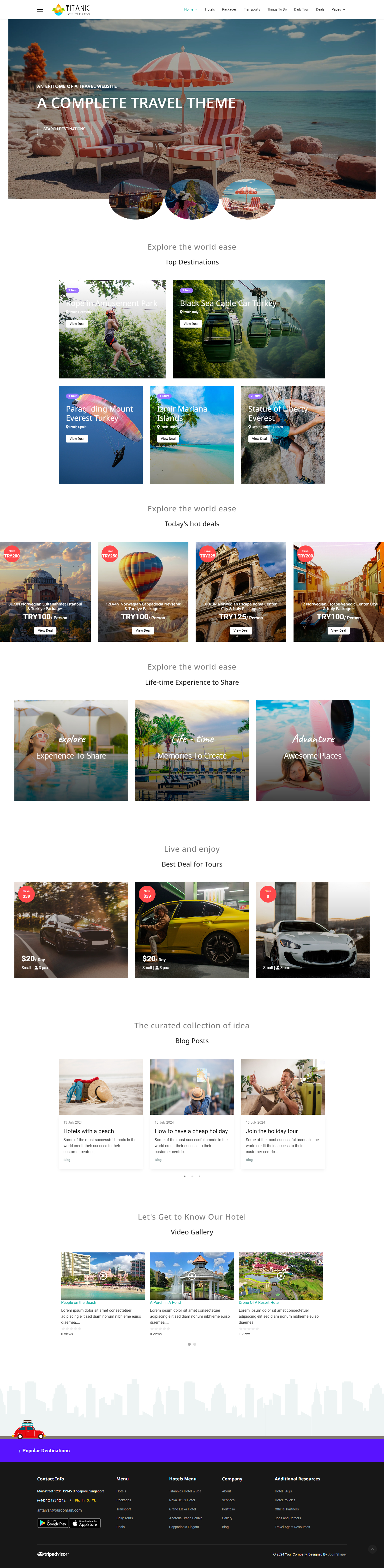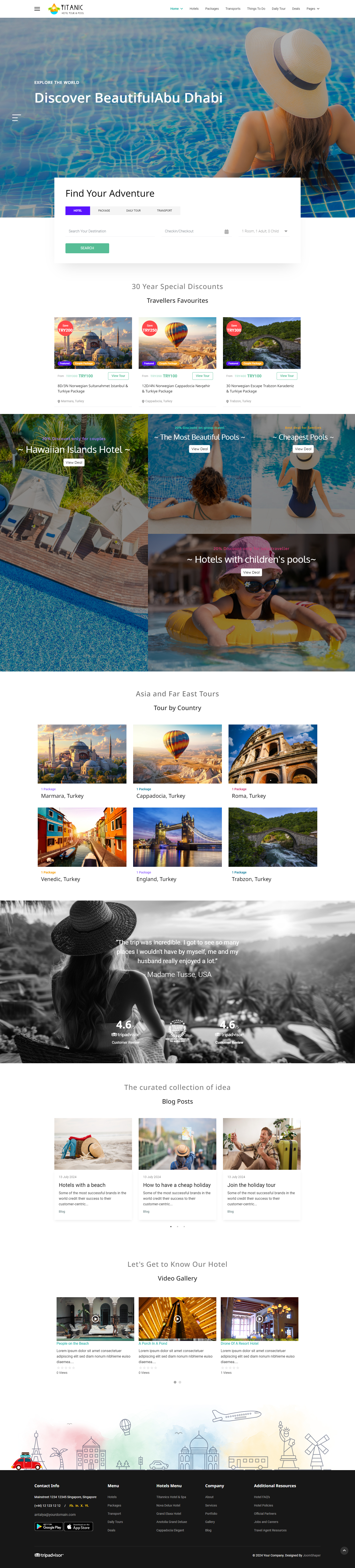 • Pages: Hotel Teması, Home World Tour, Home Destinations, Home Package Deals, Boat Tour & Pool, Hotels, Packages, Transports, Things To DoDaily, Tour Deals, Video Gallery, Images Gallery, Food and Price, Events, Contact, Blog and Portfolio