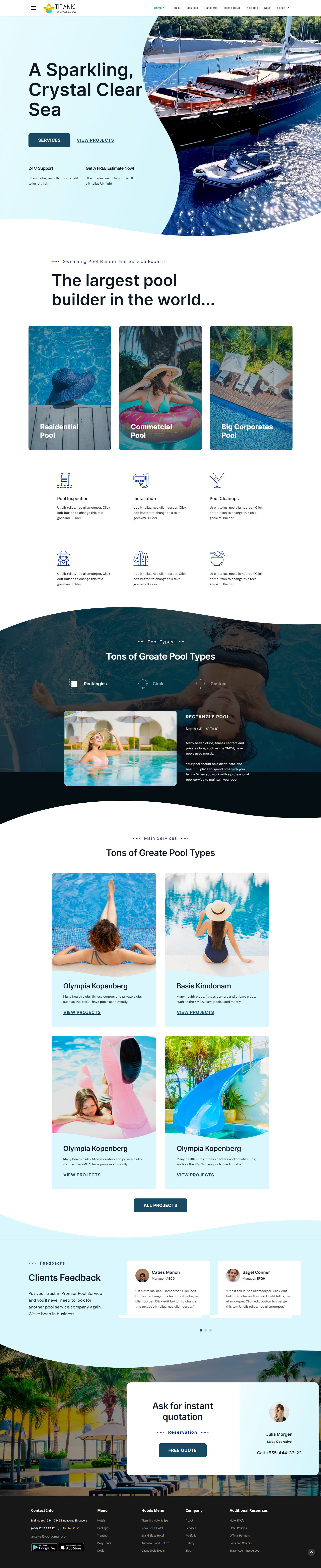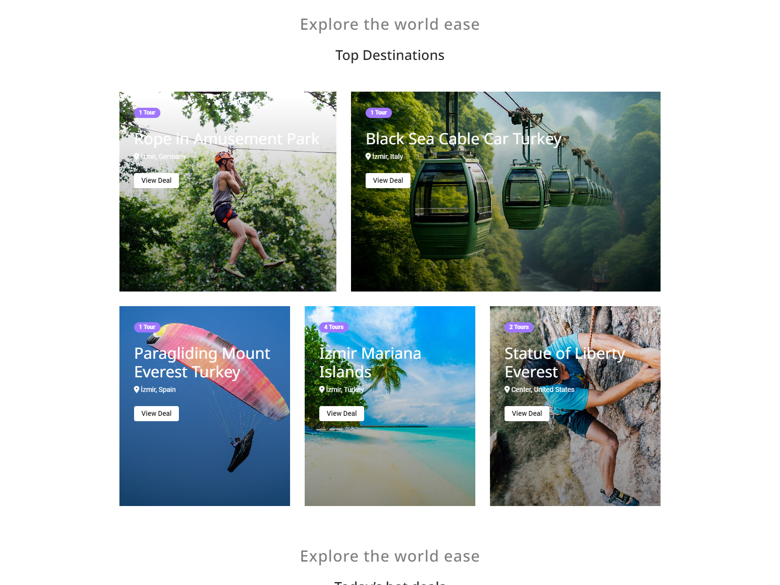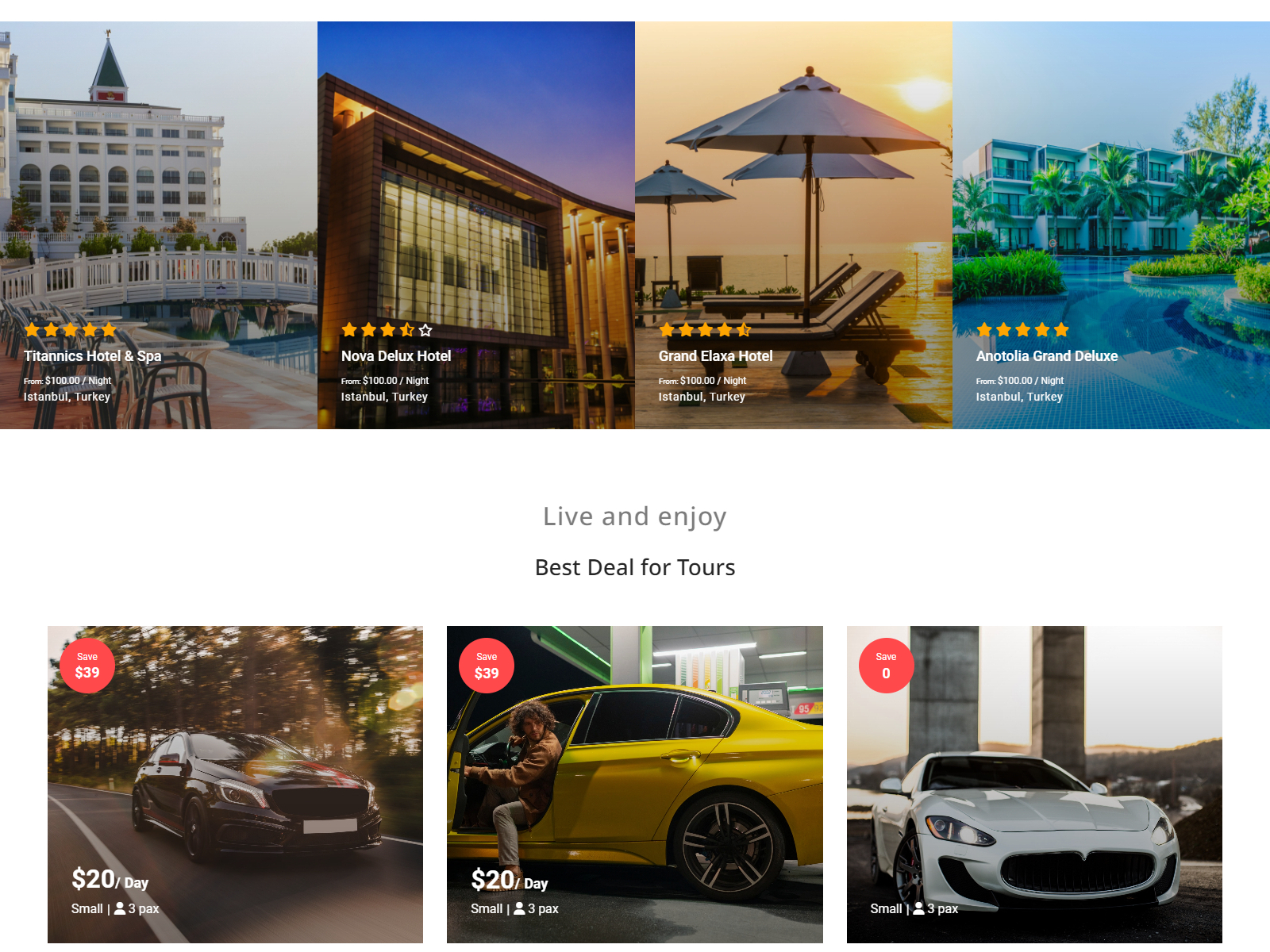 • Pages: Hotel Teması, Home World Tour, Home Destinations, Home Package Deals, Boat Tour & Pool, Hotels, Packages, Transports, Things To DoDaily, Tour Deals, Video Gallery, Images Gallery, Food and Price, Events, Contact, Blog and Portfolio