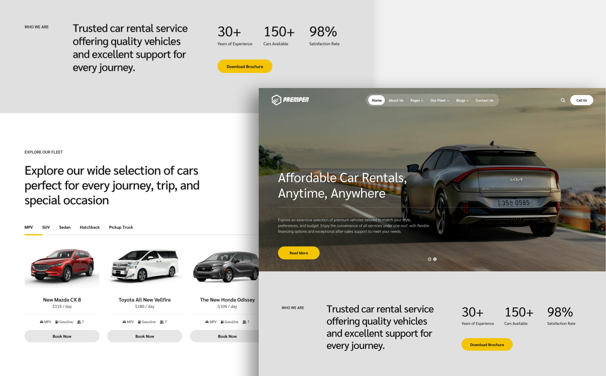 - Stunning Homepages : Choose from three captivating homepage designs tailored to suit your brand. Whether you prefer a sleek, modern look or a bold statement, Prempen has layouts that enhance your car rental business.