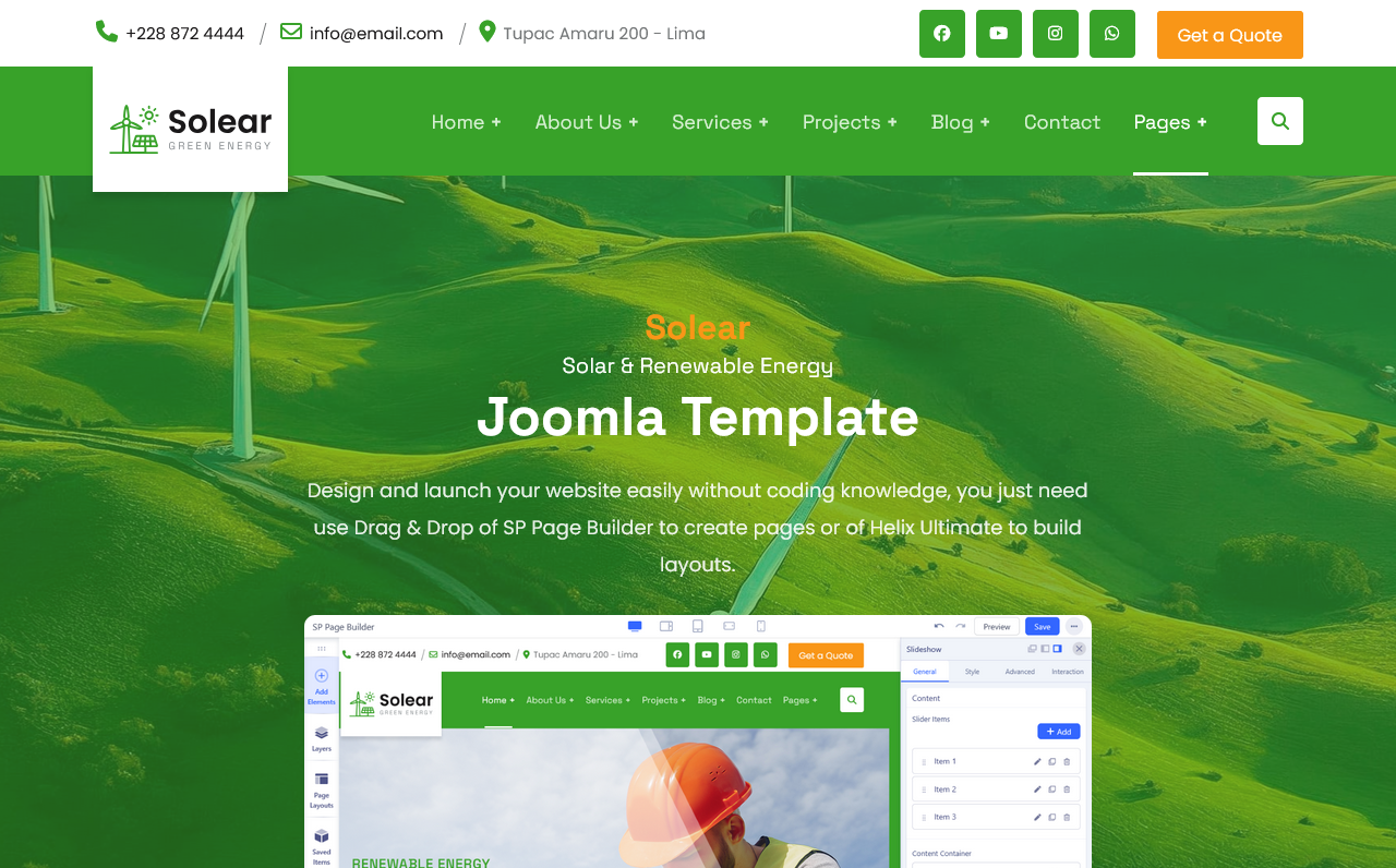 SP Page Builder allows you to create professional pages using a drag and drop system, live editing, and tools for exporting and importing pages, providing a complete and modern solution for service websites or solar, wind and renewable energy projects.