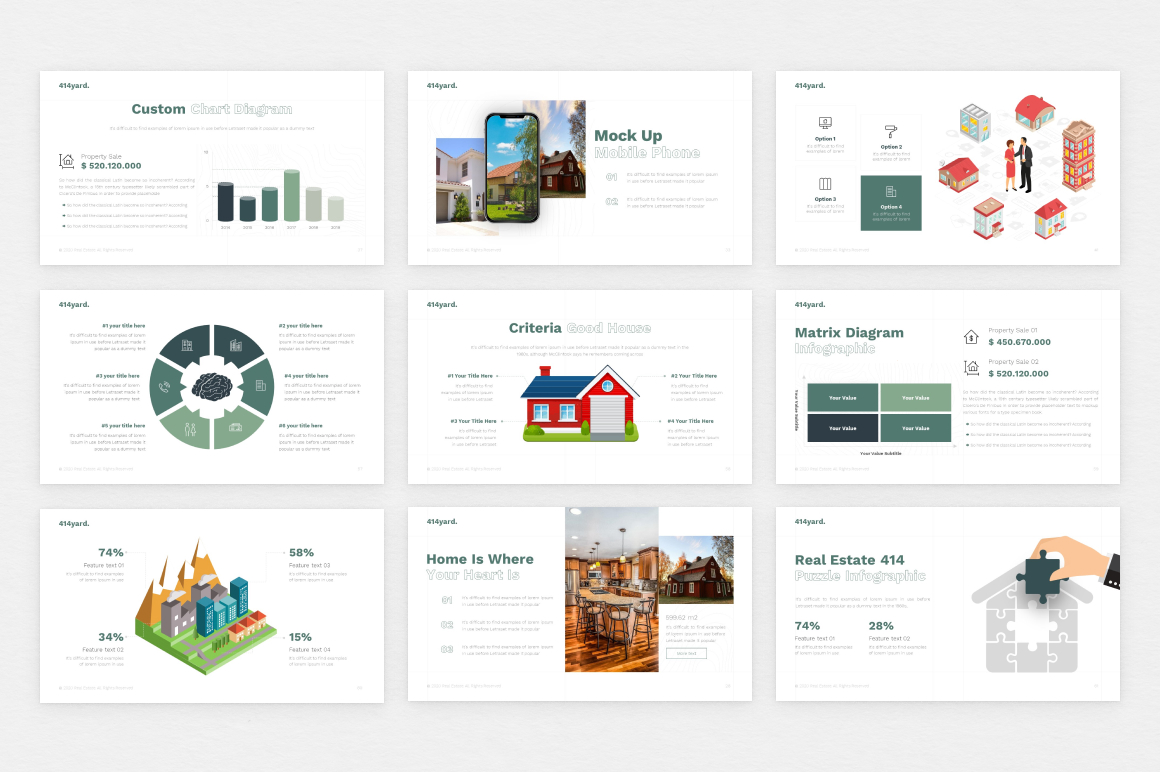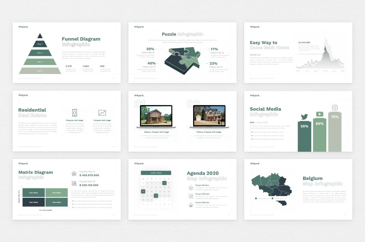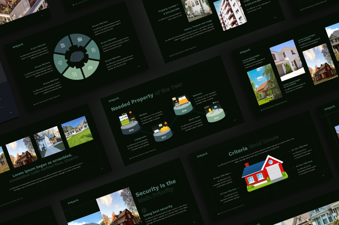 What is the best part? Surprisingly, this presentation template also provides data visualization like charts, diagrams, and infographics to interpret the data concisely. 414 Yard Real Estate Modern Keynote Template is a perfect choice as a promotional tool to help raise awareness, showcase your work, and explain your services packages.