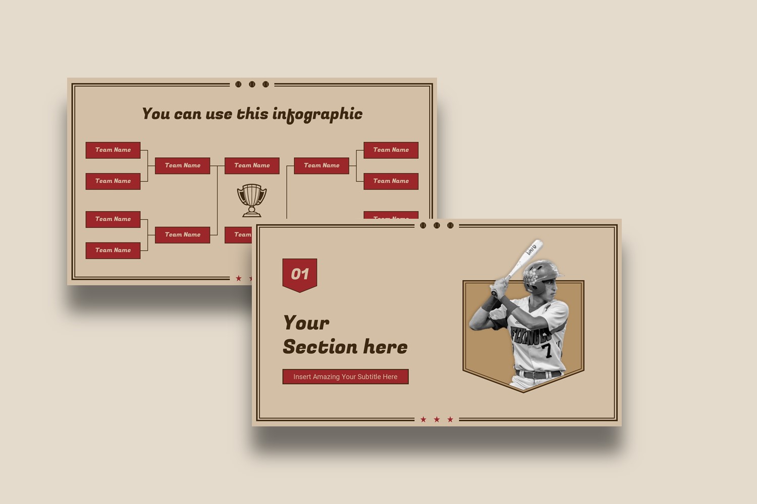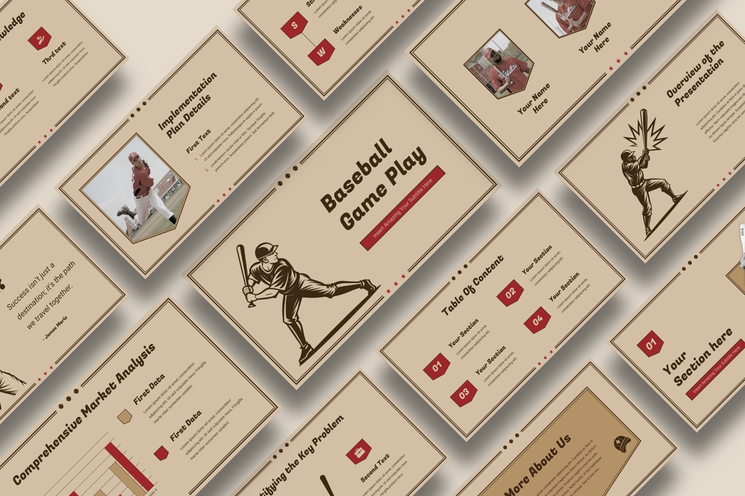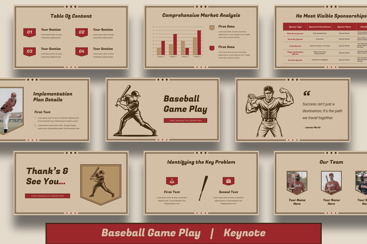 Hit a home run with your presentations using our Baseball Sport template for Keynote. This deck features an inviting warm beige background accented with rich deep red and dark brown tones, bringing an authentic baseball feel to every slide. Designed with engaging illustrations throughout, this template is perfect for showcasing game strategies, team stats, player profiles, and training tips. Ideal for coaches, sports analysts, and baseball enthusiasts, this template adds a professional yet spirited touch to any baseball-themed presentation.