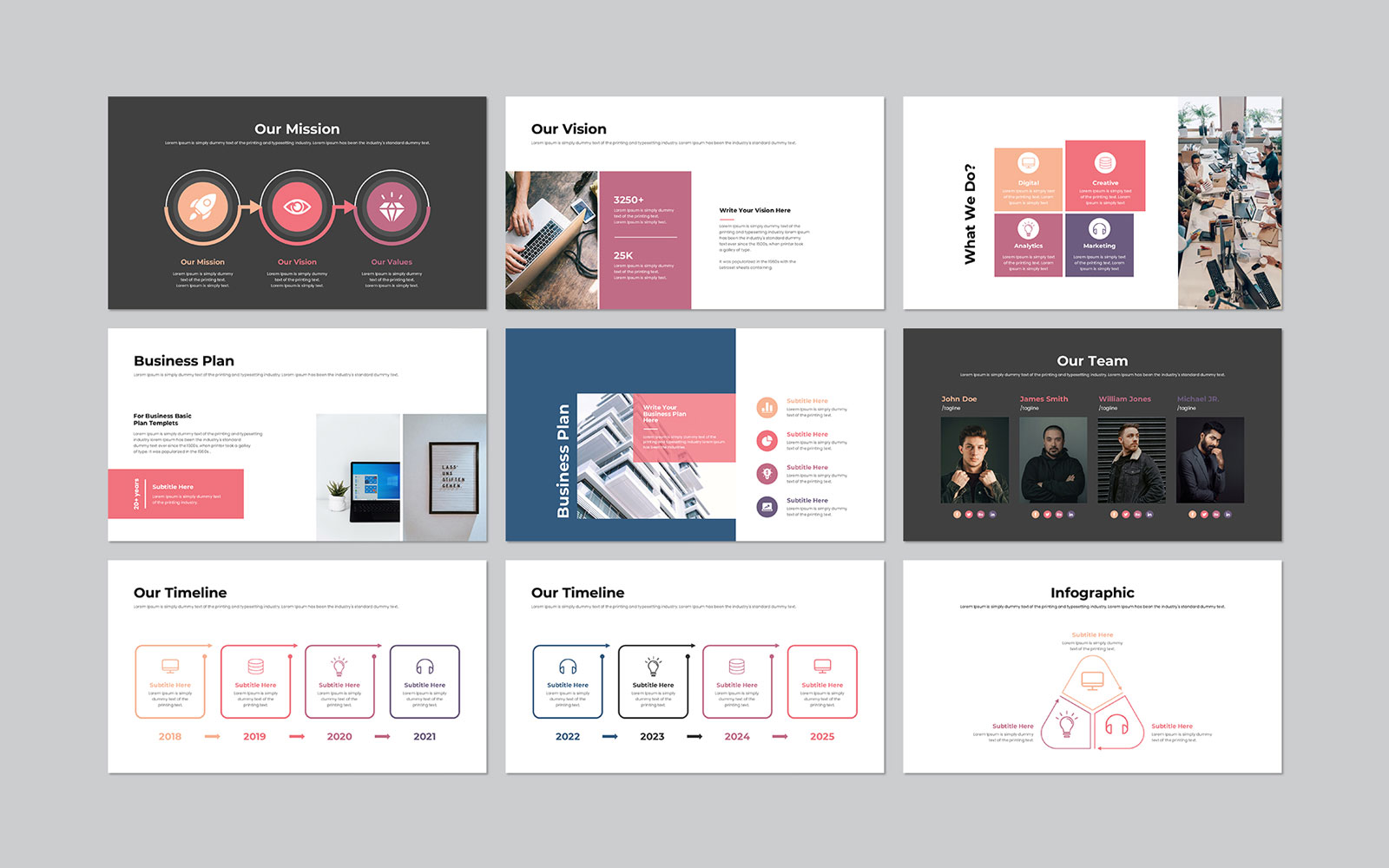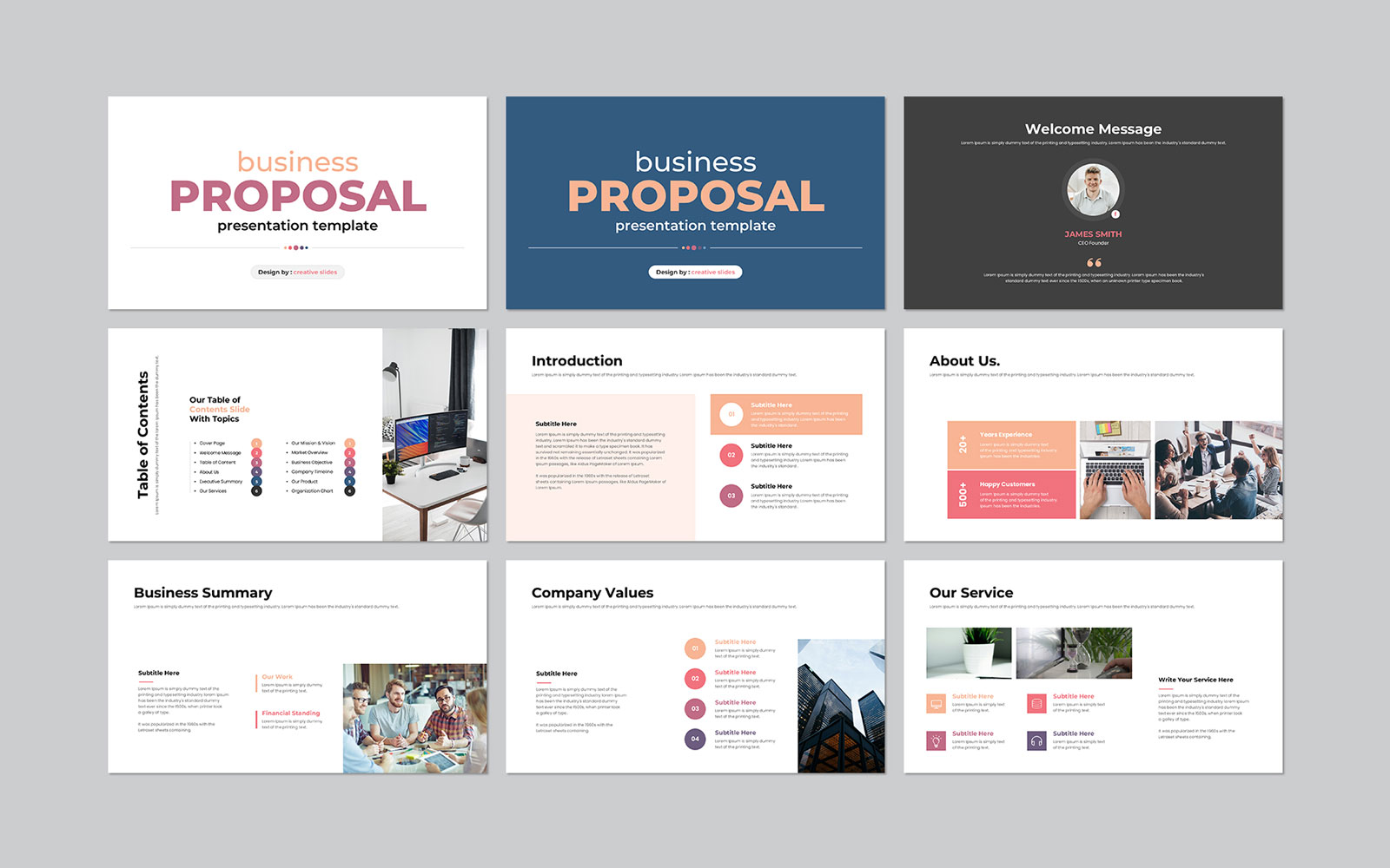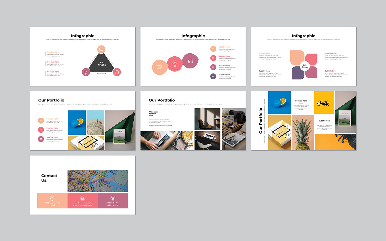 Present your works in a professional and clean way with business presentation template. This is a simple, contemporary but powerful design that includes creative photo layouts, infographics, tables, vector icons, diagrams and tons of great features to show your work and your company profile on another level.