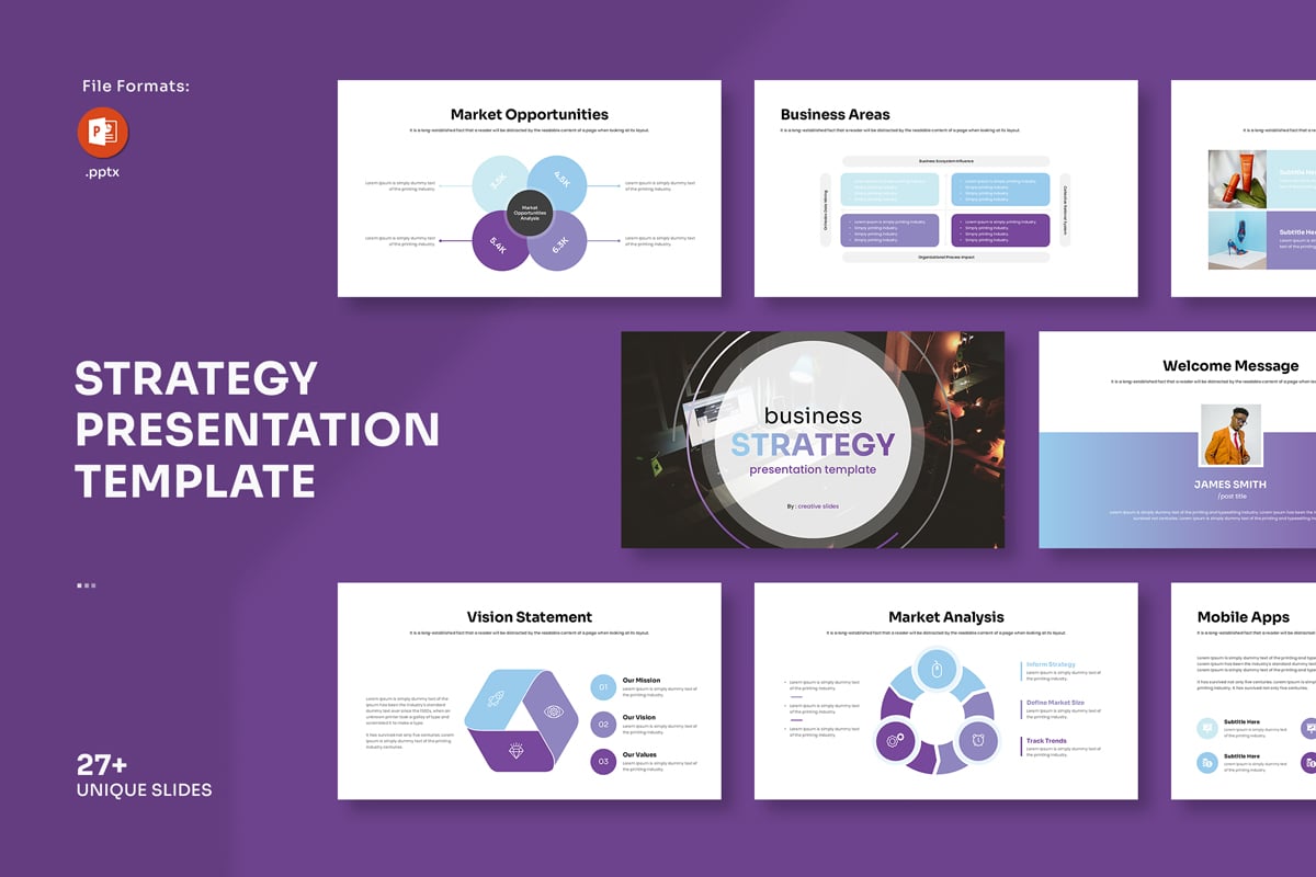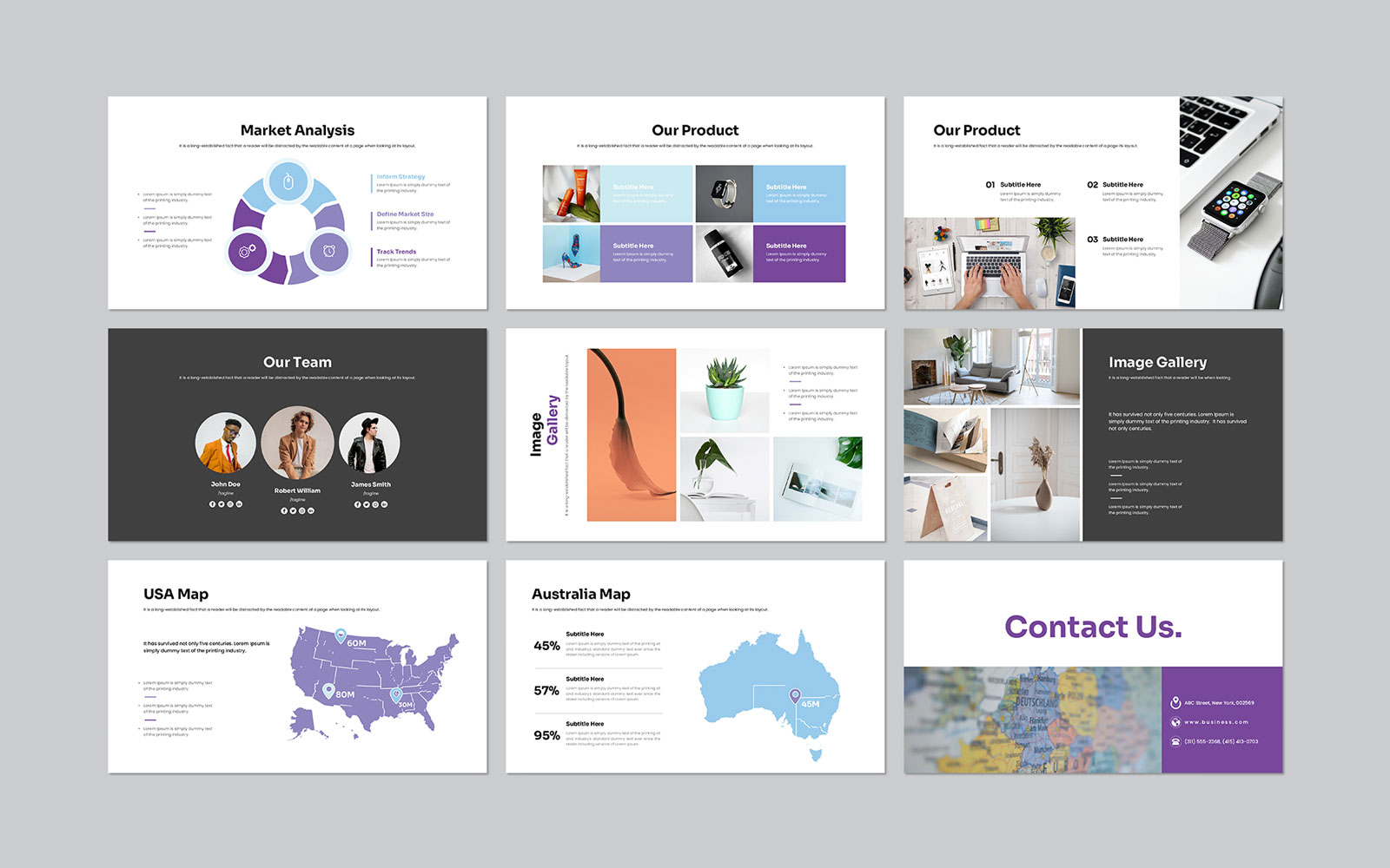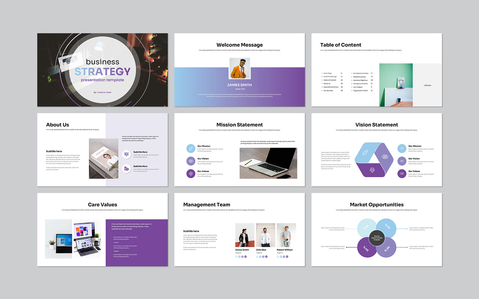 Present your works in a professional and clean way with business strategy presentation template. This is a simple, contemporary but powerful design that includes creative photo layouts, infographics, tables, vector icons, diagrams and tons of great features to show your work and your company profile on another level.