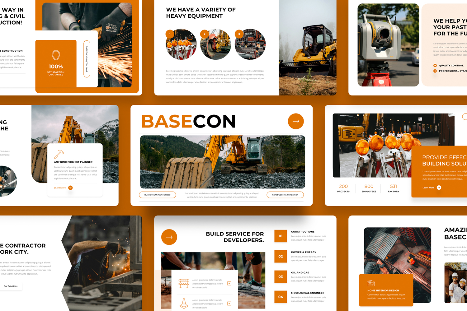 Basecon is a clean, industrial-style deck built for contractors, builders, and engineering firms. Using bold orange highlights, strong grids, and clear iconography, it helps you present services, heavy-equipment capability, safety guarantees, and track record with confidence.