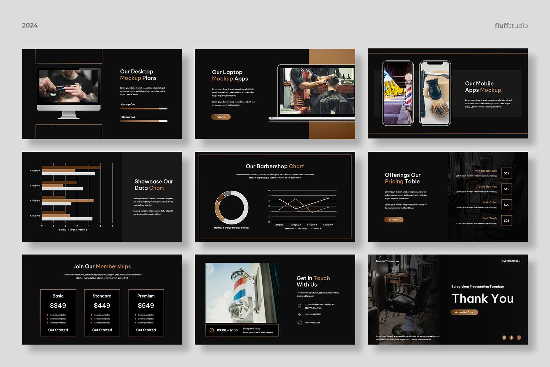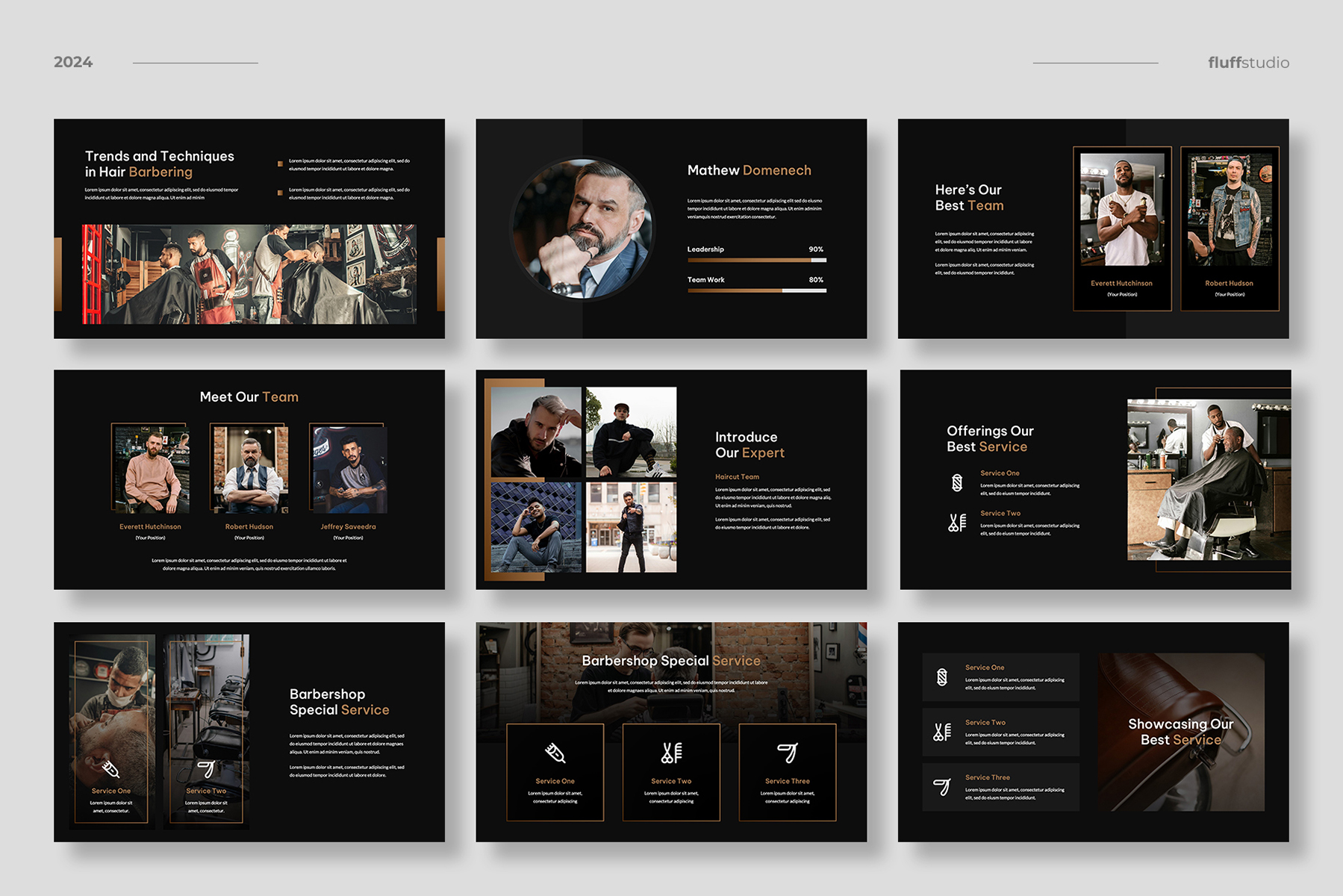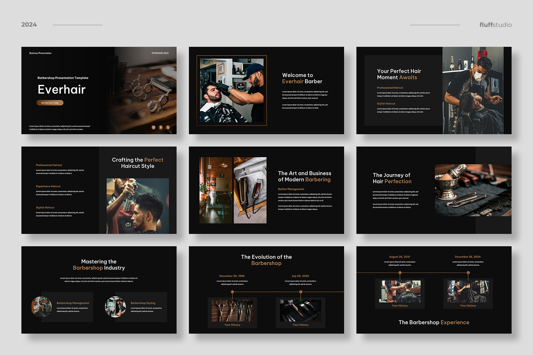 Perfect for any kind of barbershop & haircut business, grooming & hairstyle salon, luxury & fashion, project proposal, startup pitch deck, portfolio, company profile, marketing kit, etc.