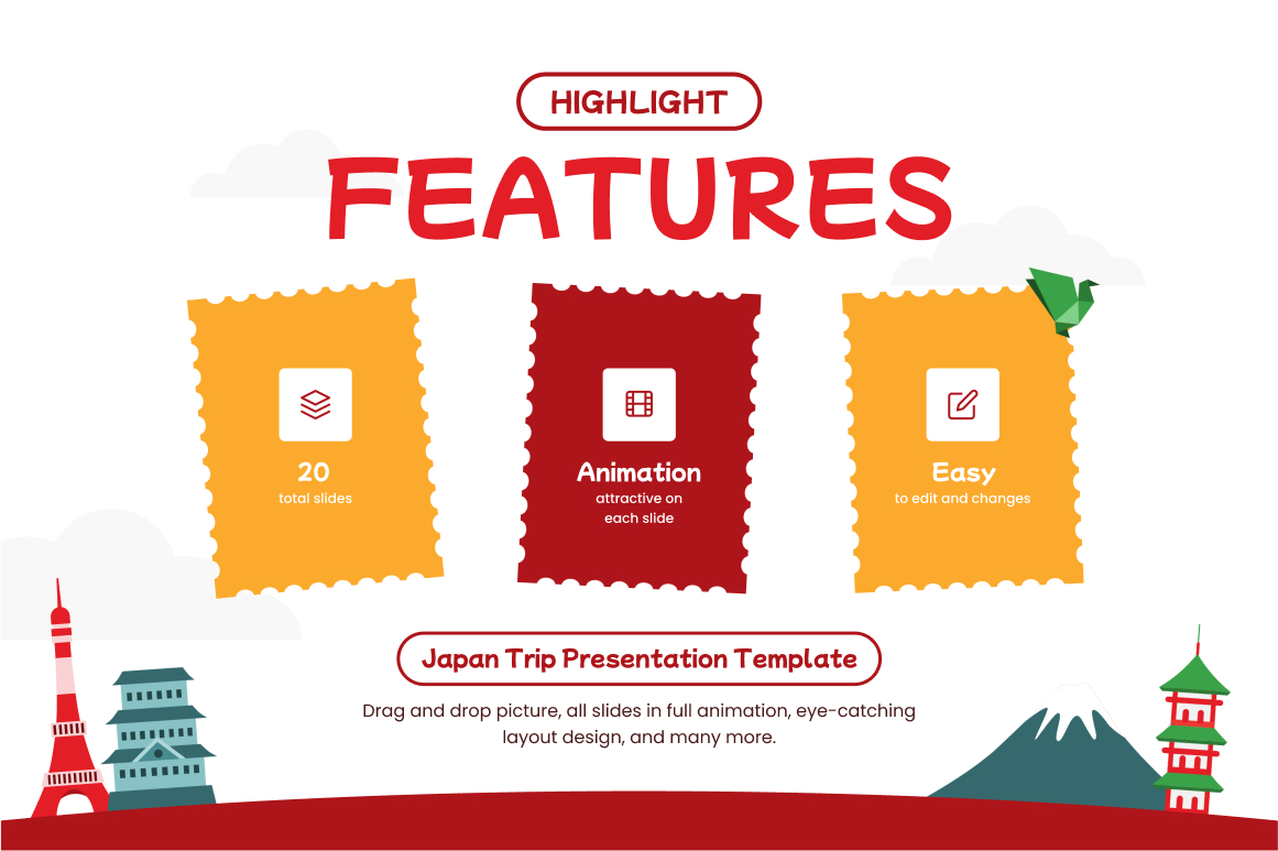 Elevate your presentations with the “Explore Japan” Keynote template. With 20 professionally designed slides, full animations, and easy editing capabilities, this template empowers you to create captivating and impactful presentations effortlessly. Impress your audience, deliver your message with style, and make a lasting impact. Download now and take your presentations to new heights!