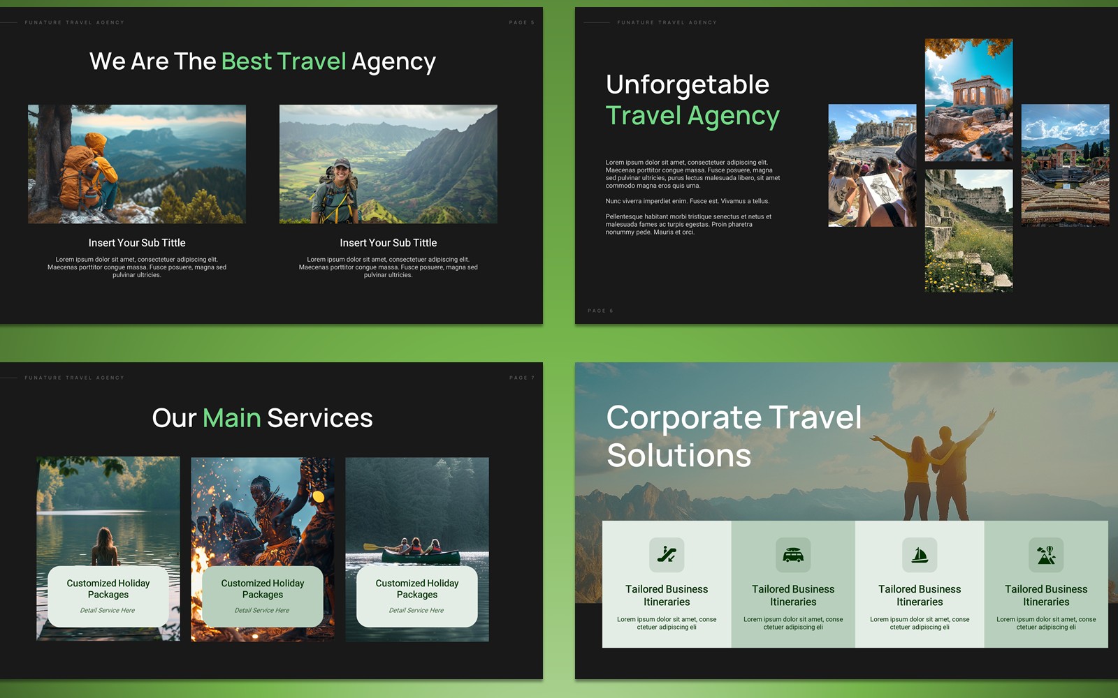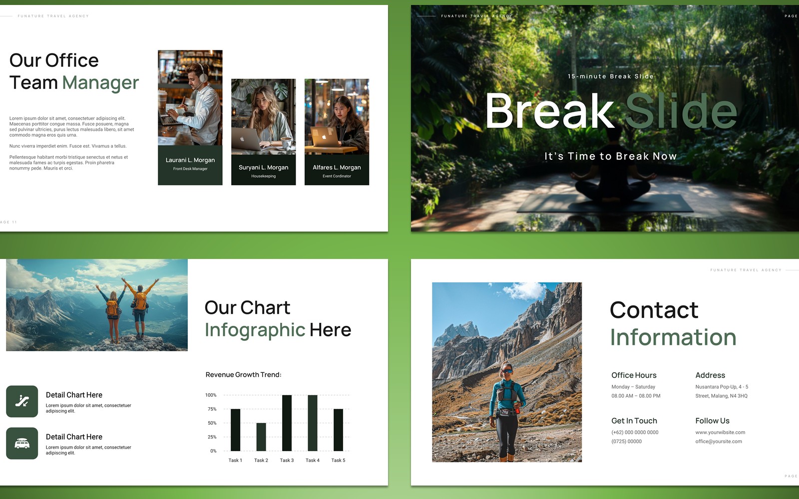 Funature - Travel Agency Keynote is designed to be intuitive and stylish. It includes diverse infographics such as bar charts, circular graphs, line charts, and more, making it a versatile solution for any presentation.