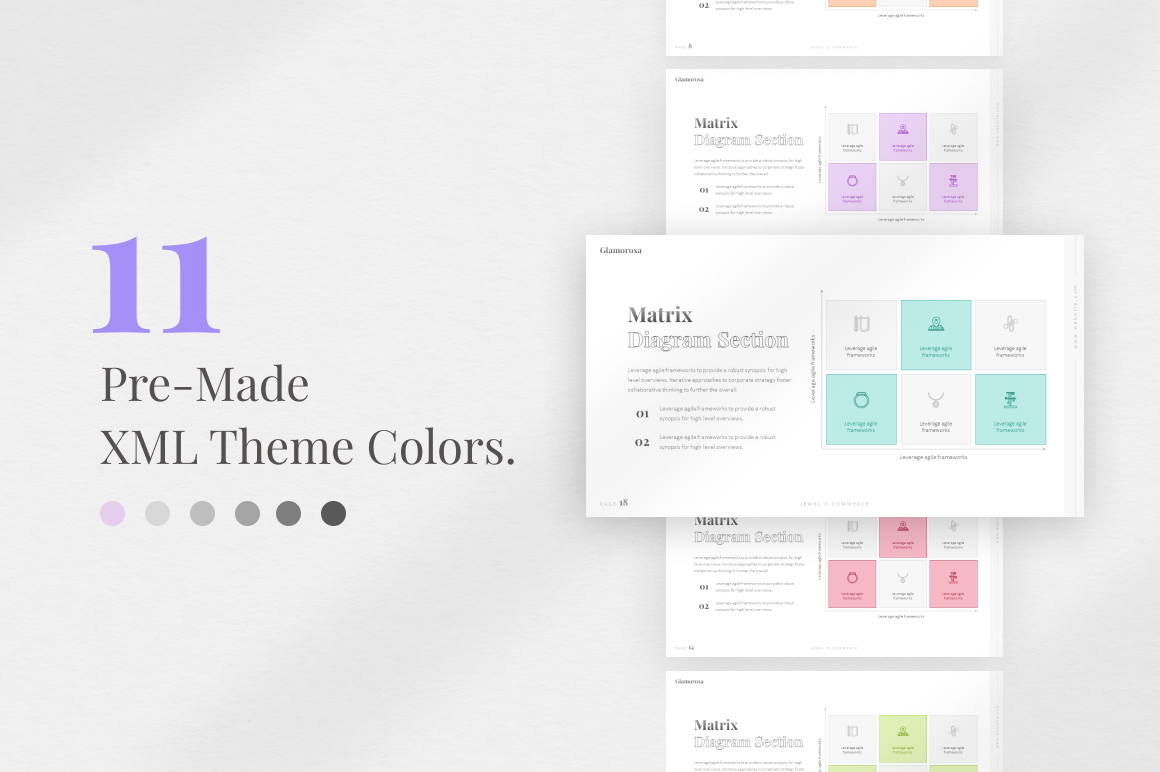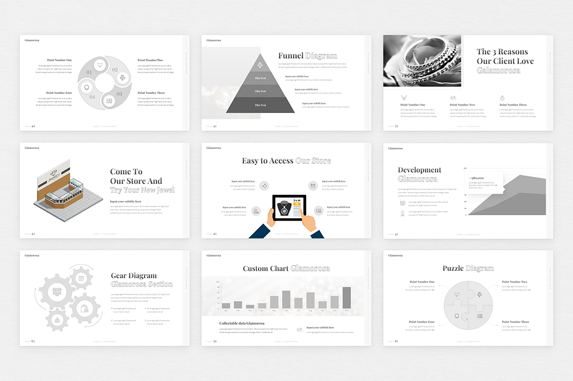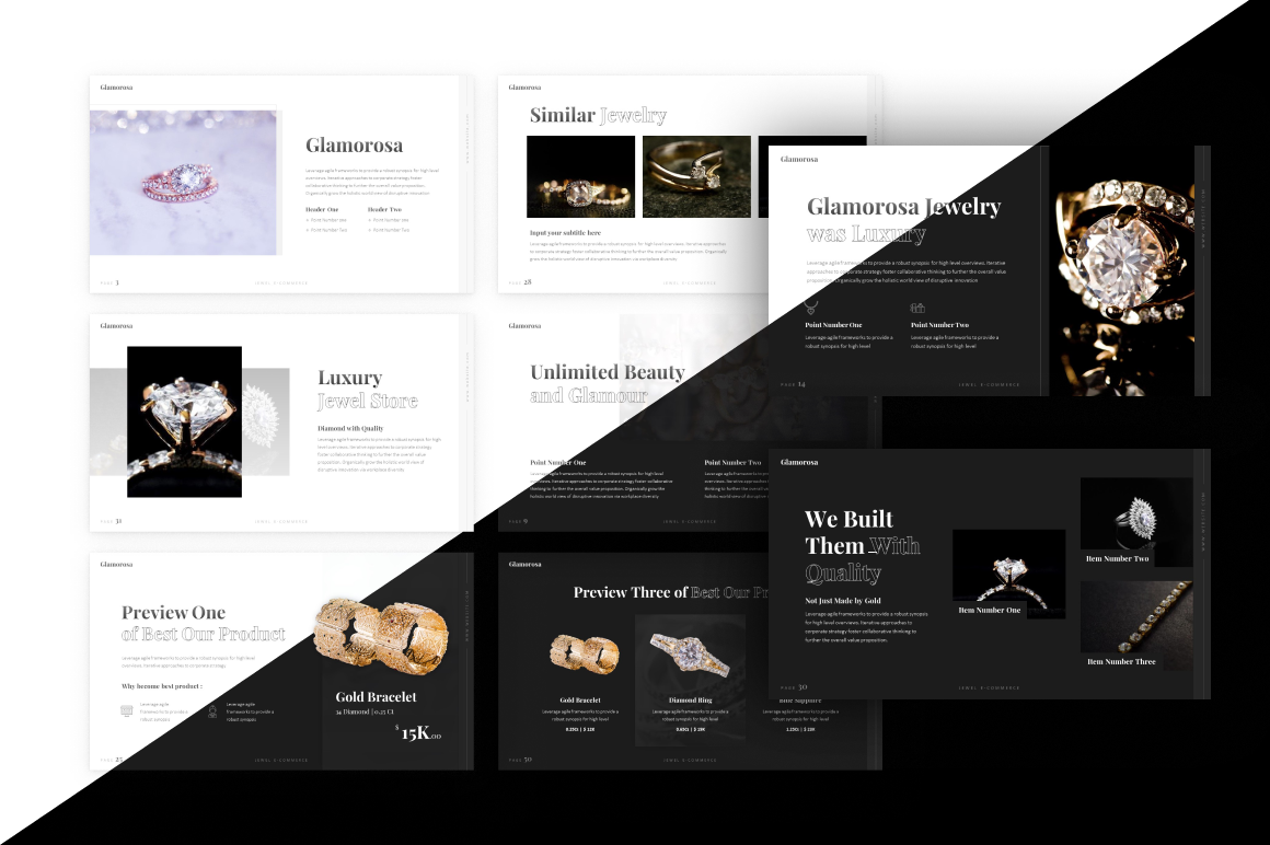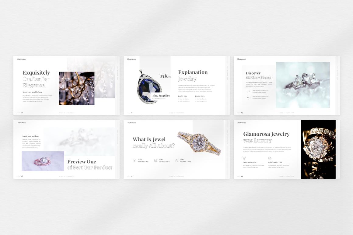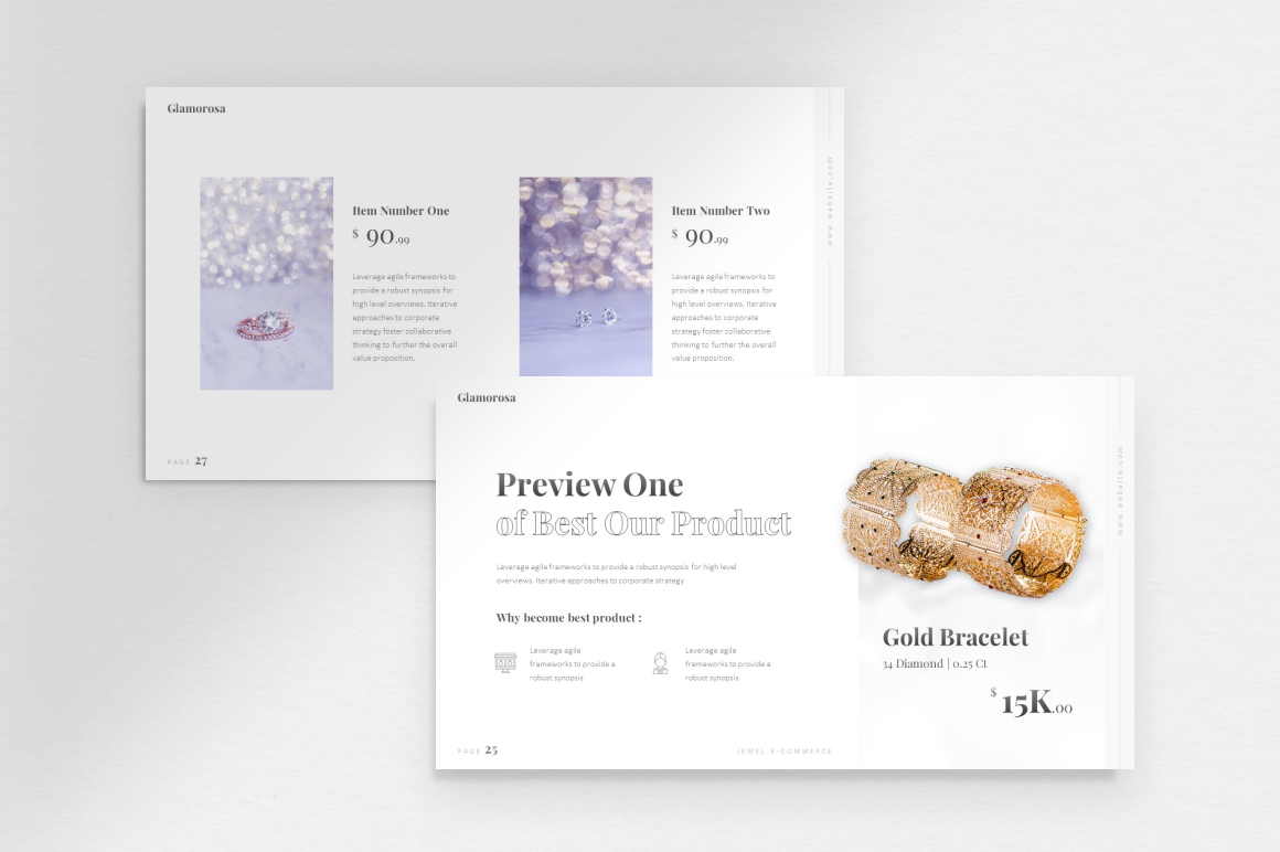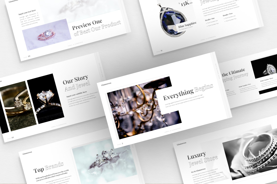 What is the best part? Surprisingly, this presentation template also provides data visualization like charts, diagrams, and infographics to interpret the data concisely. Glamorosa Jewelry Ecommerce Keynote Template is a perfect choice as a promotional tool to help raise awareness, showcase your work, and explain your services packages.