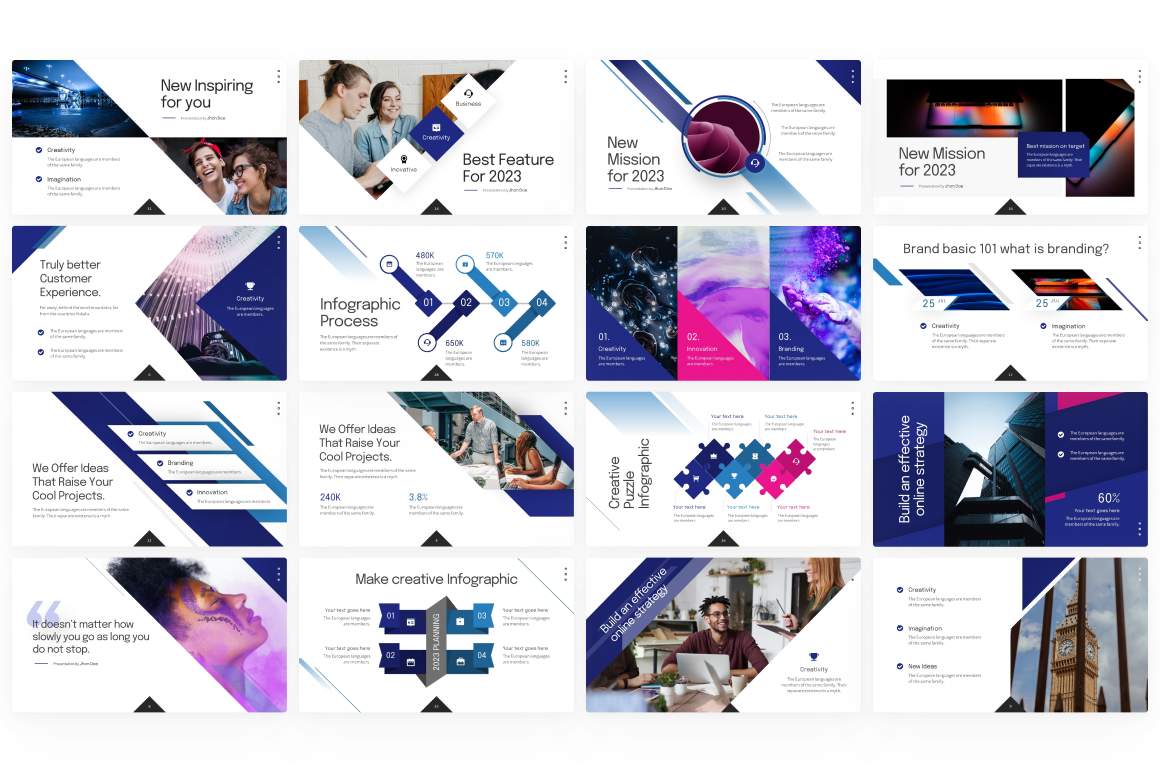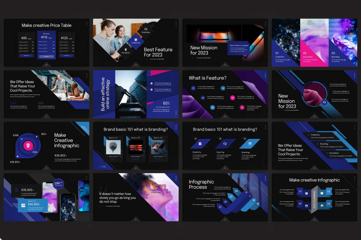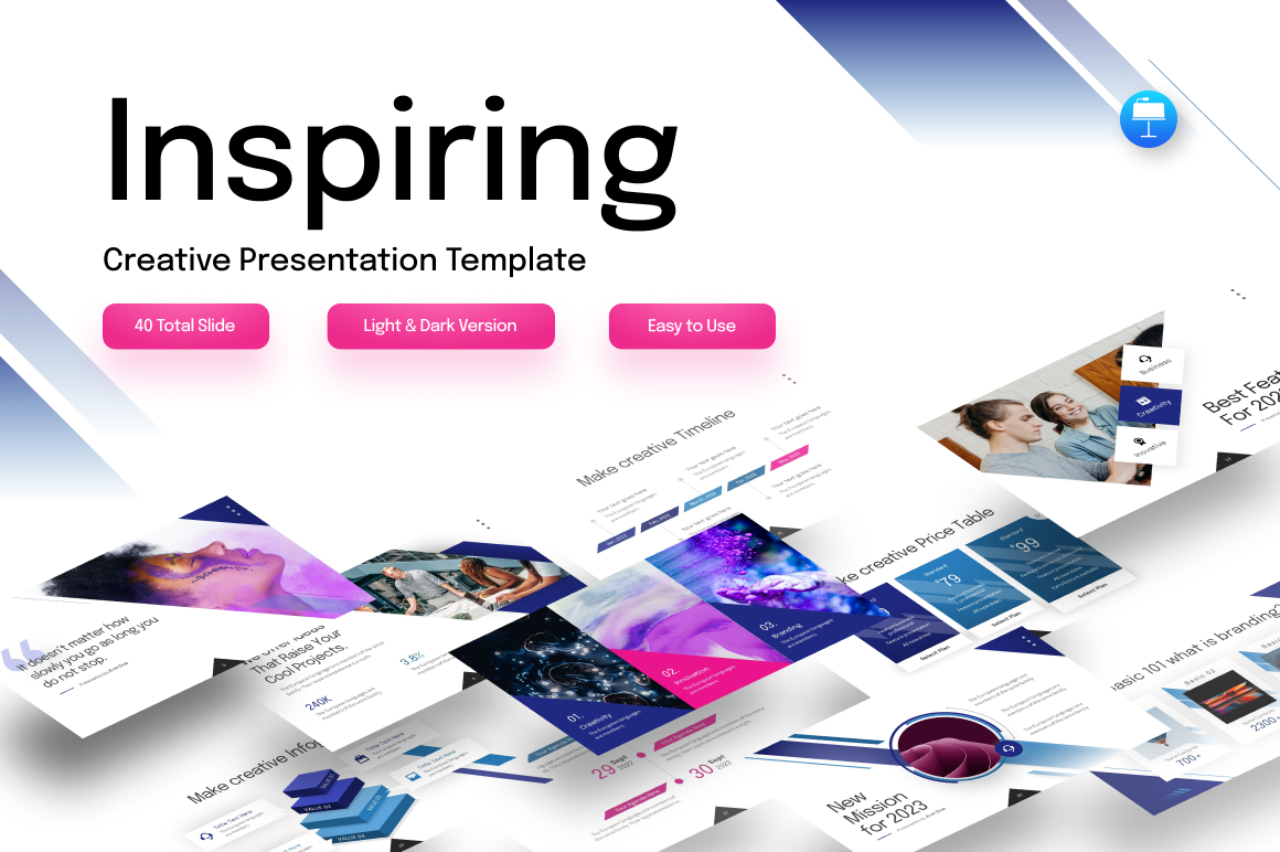 What is the best part? Surprisingly, this presentation template also provides data visualization like charts, diagrams, and infographics to interpret the data concisely. Inspiring Creative Keynote Template is a perfect choice as a promotional tool to help raise awareness, showcase your work, and explain your services packages.