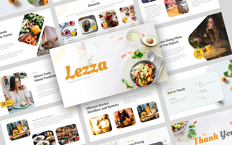 The Lezza template boasts a delightful design that harmoniously blends modern aesthetics with a touch of culinary artistry. Eye-catching visuals and tasteful color schemes create an appetizing ambiance throughout your presentation.