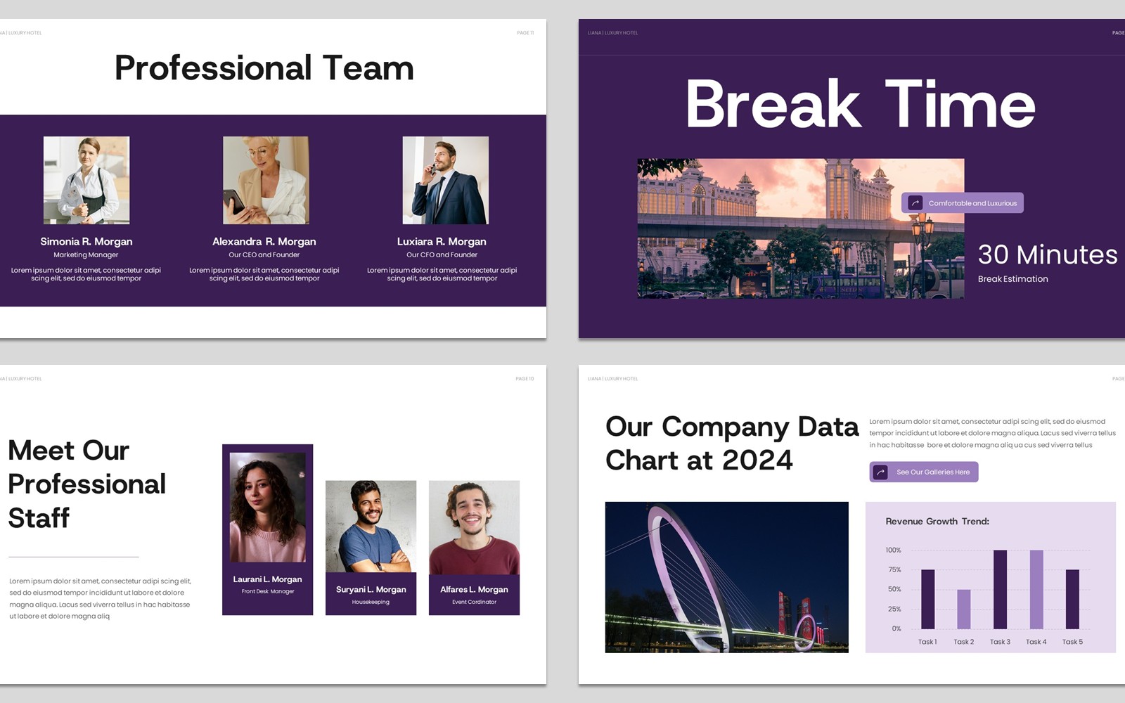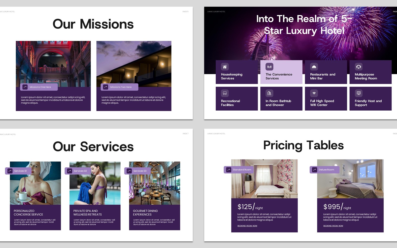 Liana - Hotel Keynote Presentation is designed to be intuitive and stylish. It includes diverse infographics such as bar charts, circular graphs, line charts, and more, making it a versatile solution for any presentation.