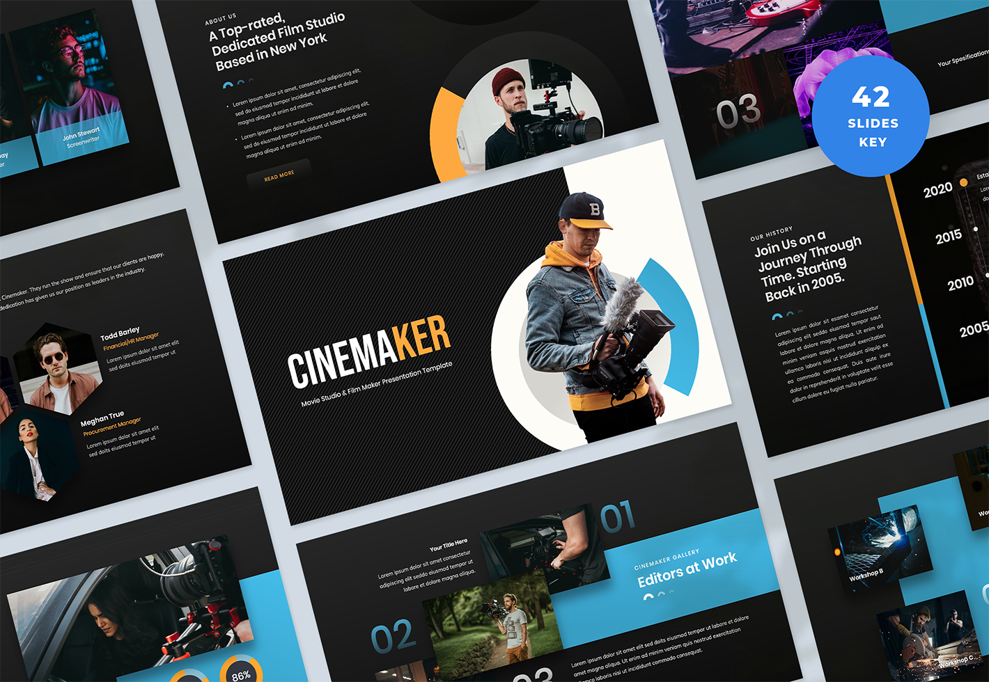 The Cinemaker Presentation Template for Keynote is a modern and sleek professional presentation that will give a boost to your business meetings and lectures. It contains 42 beautifully designed slides that can be easily edited and adjusted to suit all of your professional and business needs.