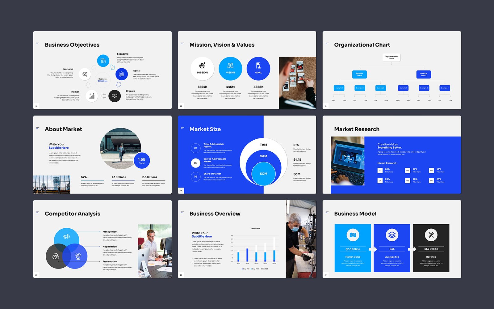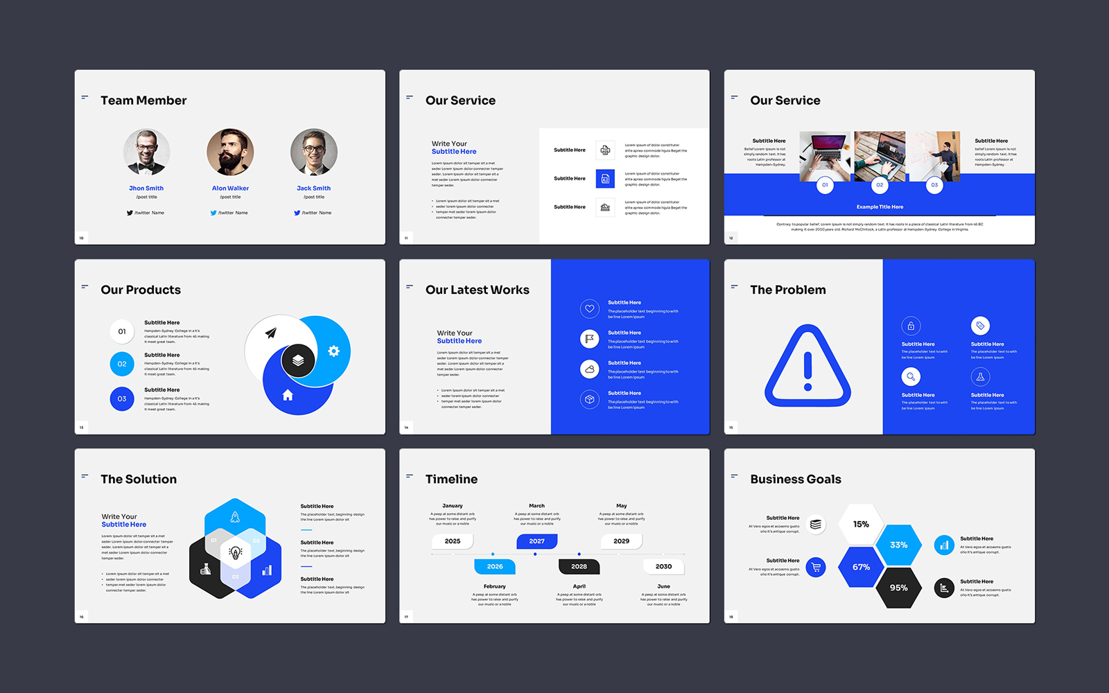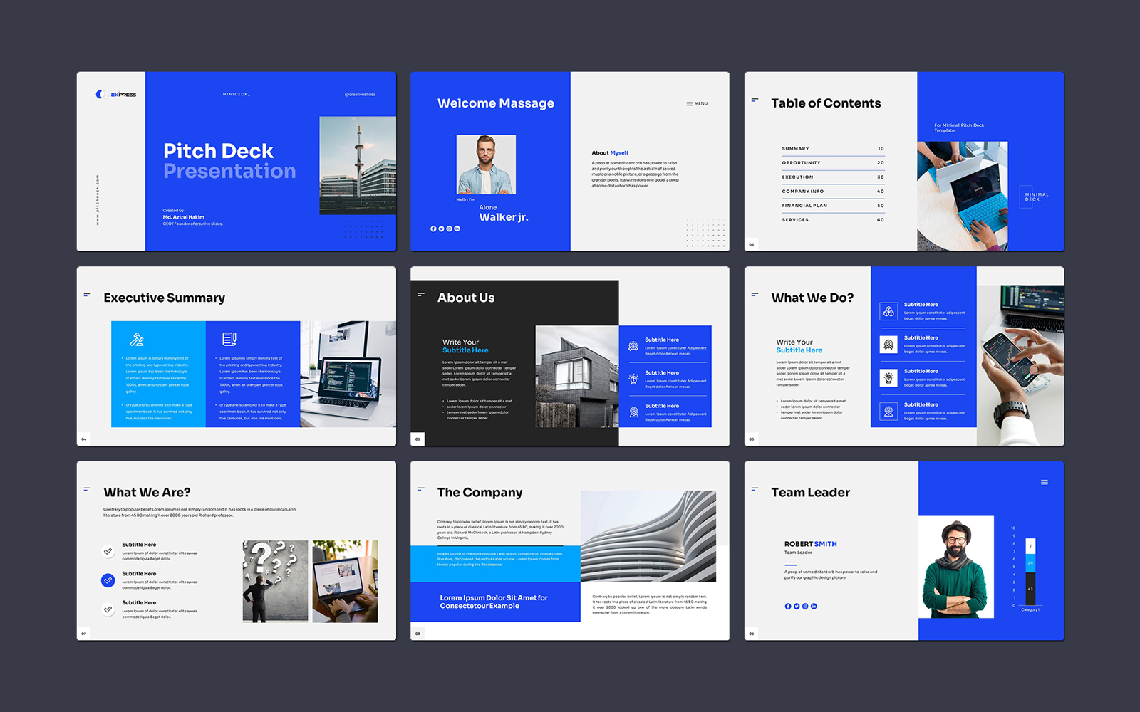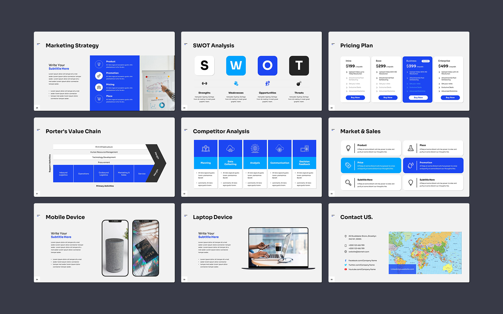 Present your works in a professional and clean way with pitch deck presentation template. This is a simple, contemporary but powerful design that includes creative photo layouts, infographics, tables, vector icons, diagrams and tons of great features to show your work and your company profile on another level.