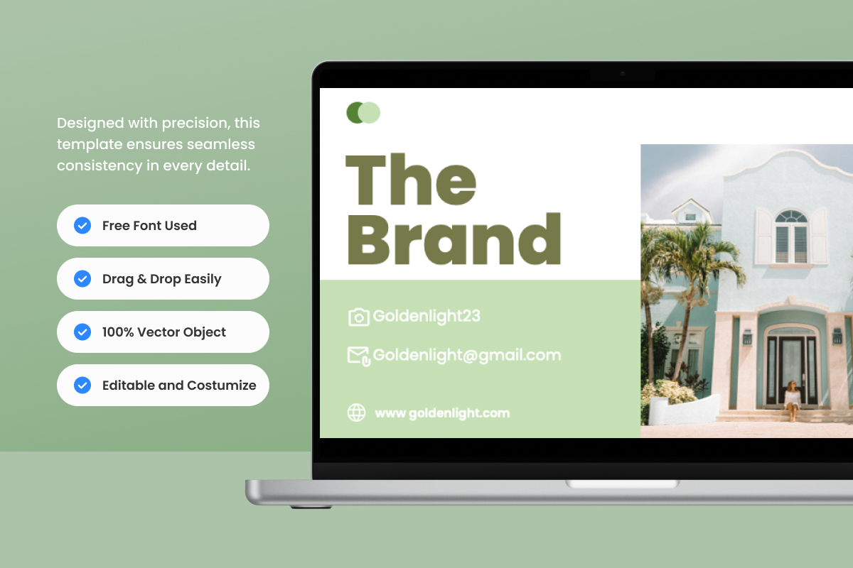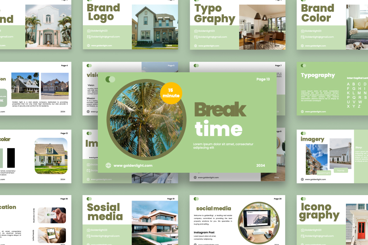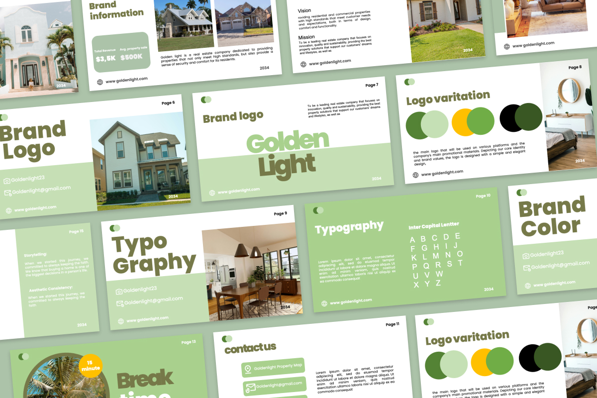 A well-structured Keynote deck designed for branding professionals in the real estate industry. This visually appealing presentation combines bold fonts, refined layouts, and modern aesthetics to make brand guidelines easy to present and understand.